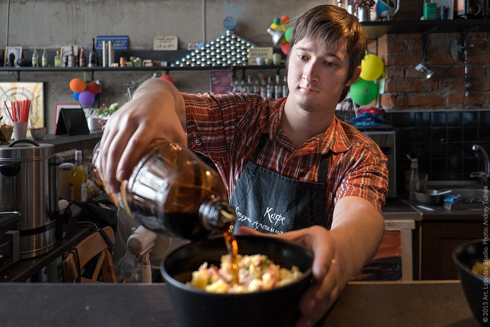 Café on the seventh floor of the studio: chef Alexander Pogudin cooks okroshka, a cold soup.