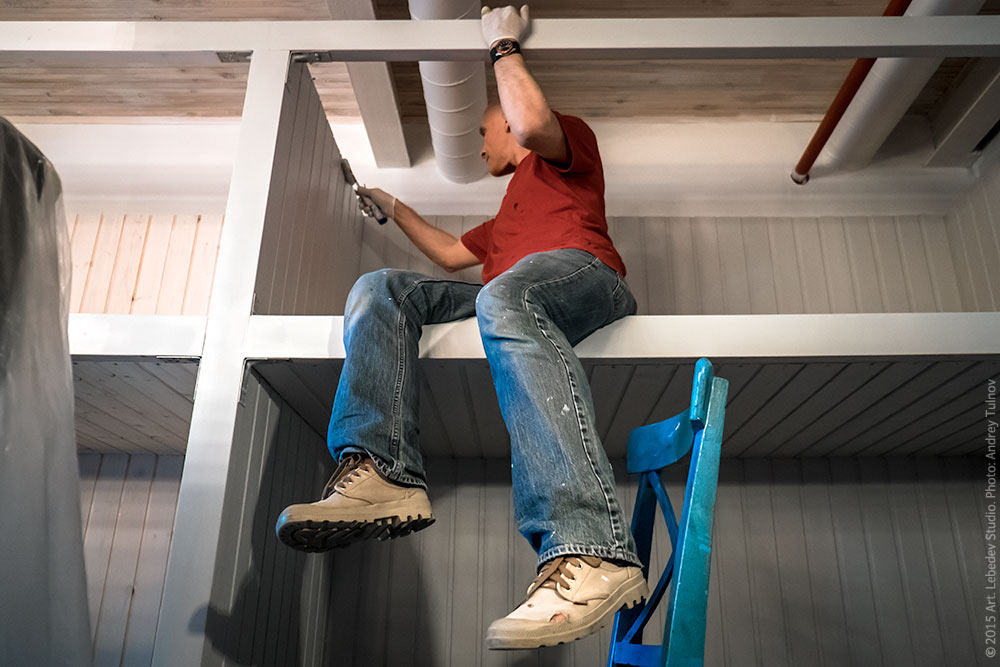 Engineer Sergei Sinitsyn renovates the studio’s hostel.