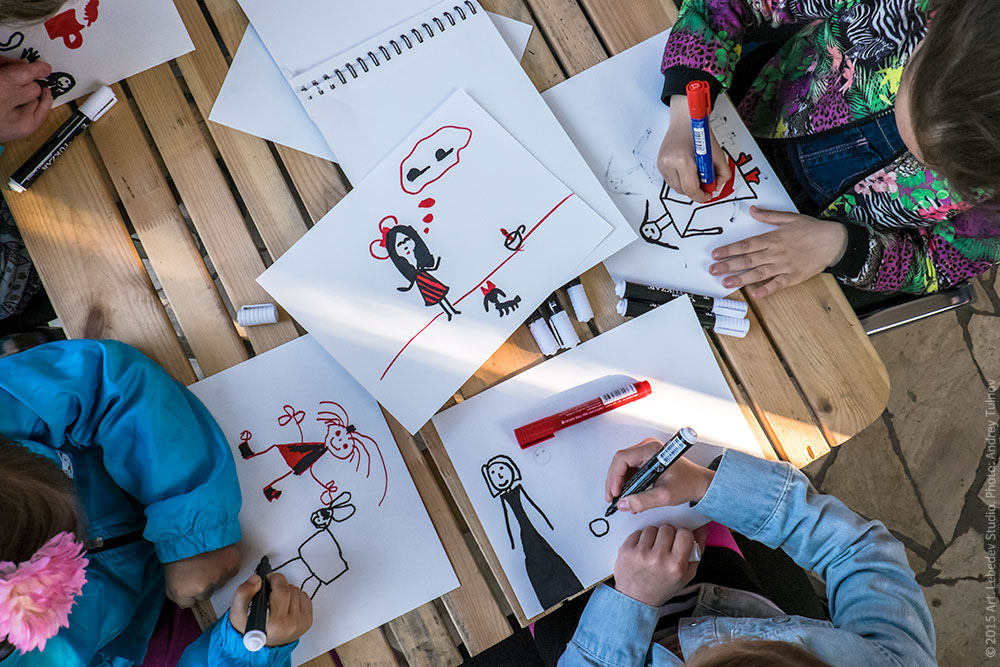 Sokolniki Park: little illustrators draw characters from the book Slippers by Nastya Kovalenkova.