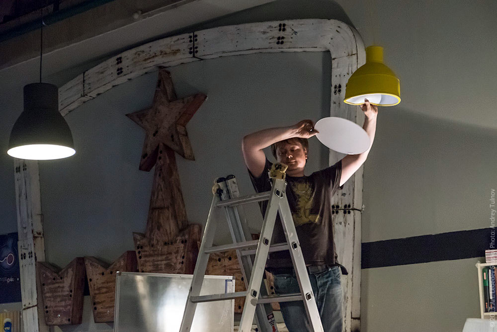 Engineer Vasily Samylkin replaces a burnt out light bulb.