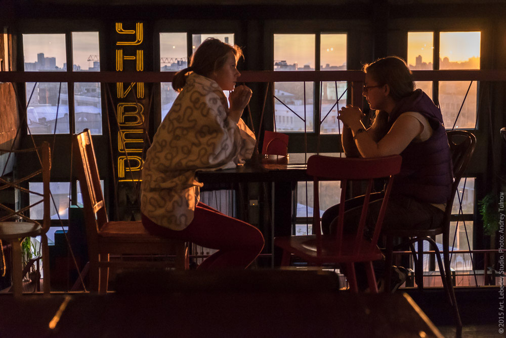 Manager Darya Kocherina and head of web design department Veronika Kyshova discuss business in the sunset.
