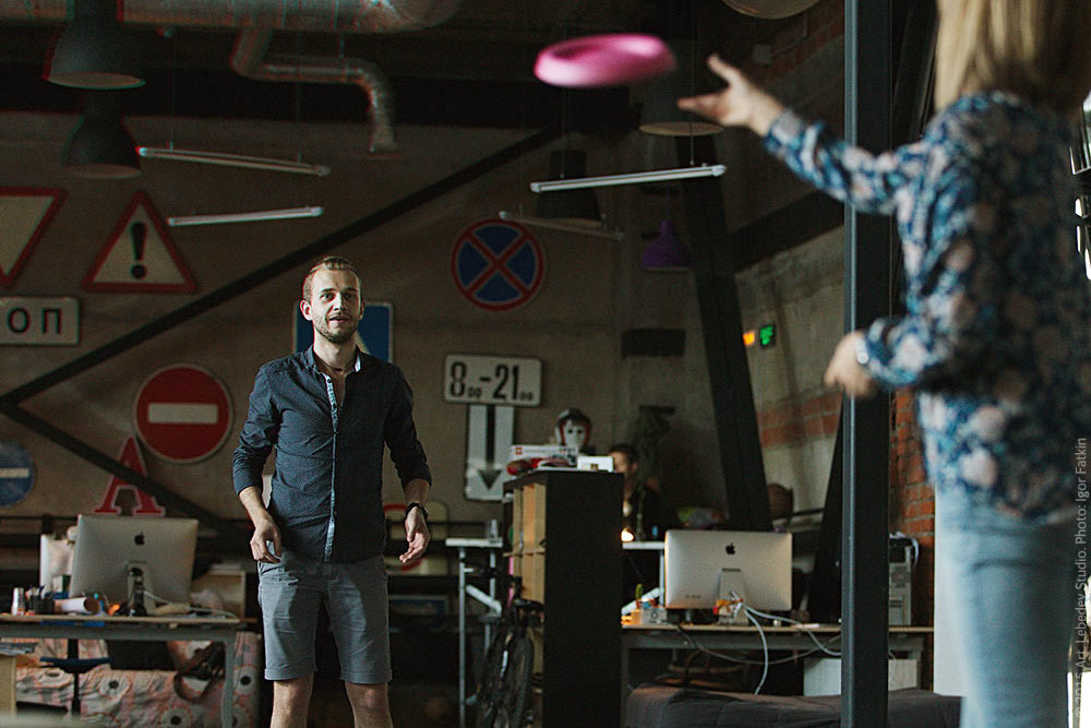Designer Vladimir Nikolaev and manager Yulya Nikolaeva play with a Frizbus flying disc.