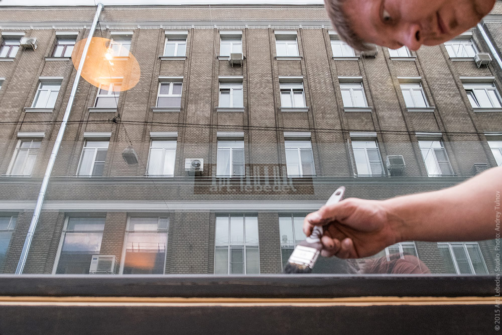 Engineer Vasily Samylkin paints a new bench by the entrance to Art. Lebedev Studio’s Big Café in Bankovsky Pereulok.