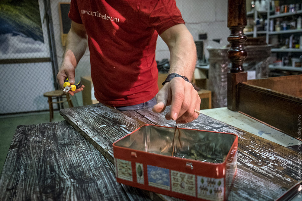 Engineer Sergey Sinitsyn renovates a table from the studio’s Big Café.