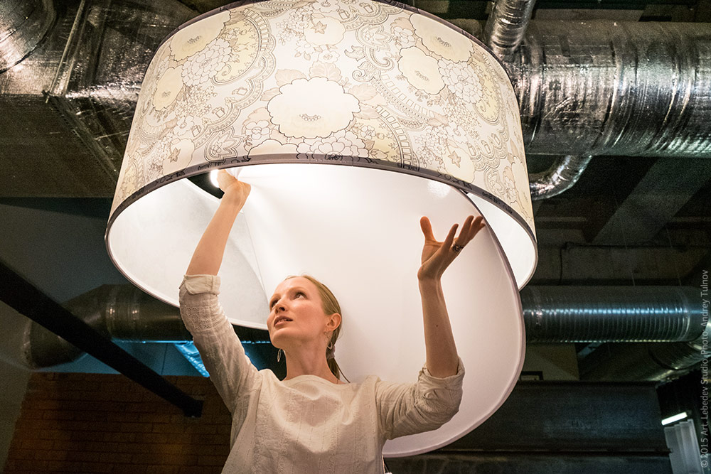 Illustrator Lizaveta Romantsova assembles a lampshade with the Shawl pattern gifted to the studio.
