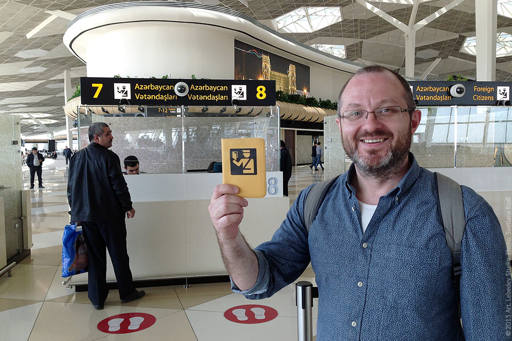 ![]() Baku (Azerbaijan): art director Ludwig Bystronovsky with Passport Control passport cover in front of passport control at Heydar Aliyev International Airport.