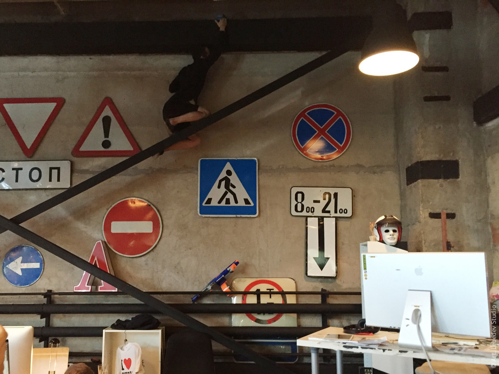 Designer Sergey Nikolaev gets the ball that got kicked up on the ceiling.