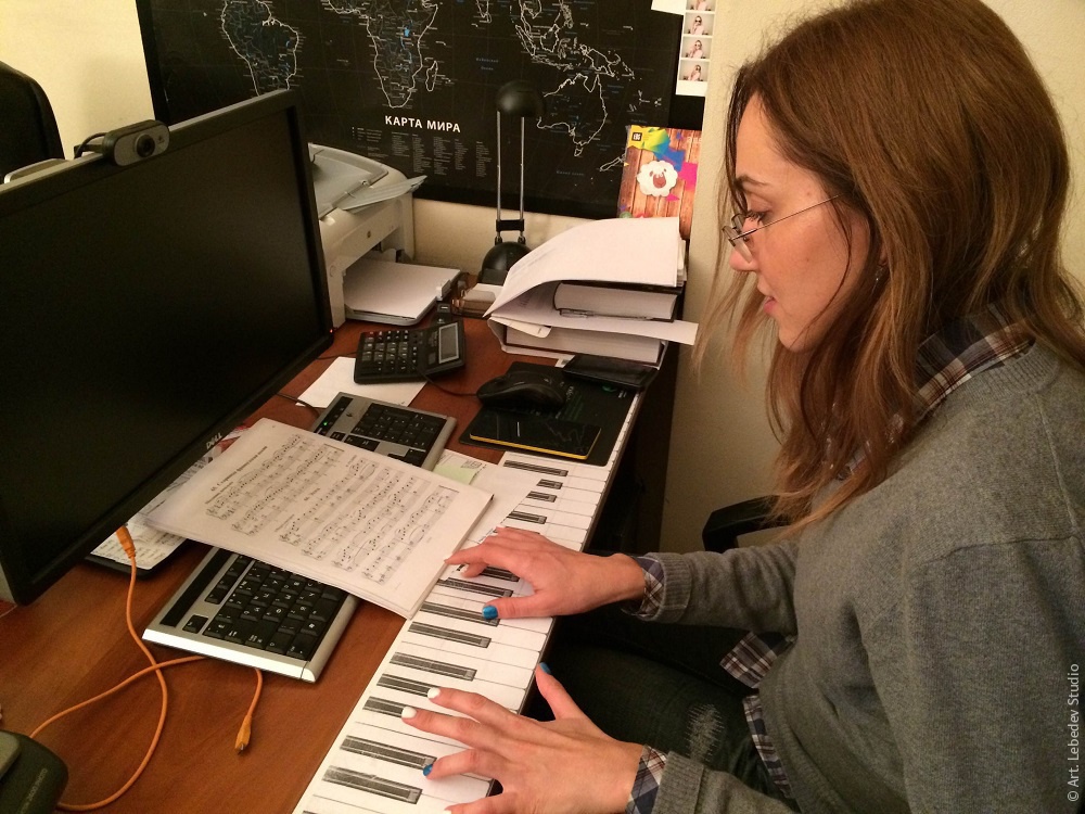 Anastasia Stupenko, manager of the Kiev office of the studio, prepares musical school homework at the end of a work day.