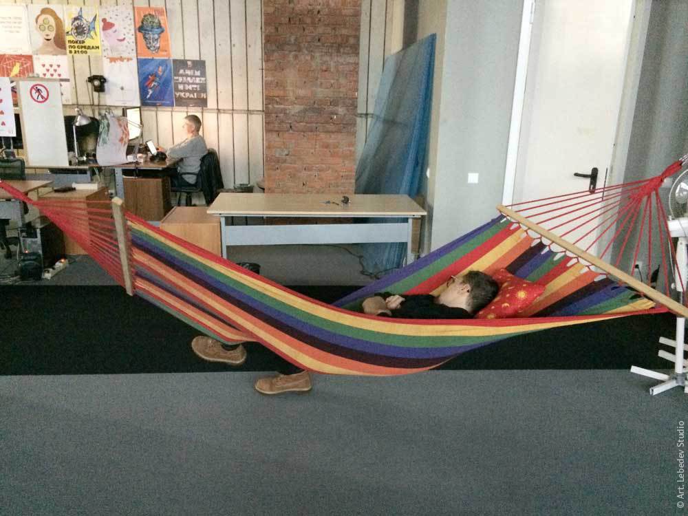 Designer Svyatoslav Fedorov is resting in a hammock.