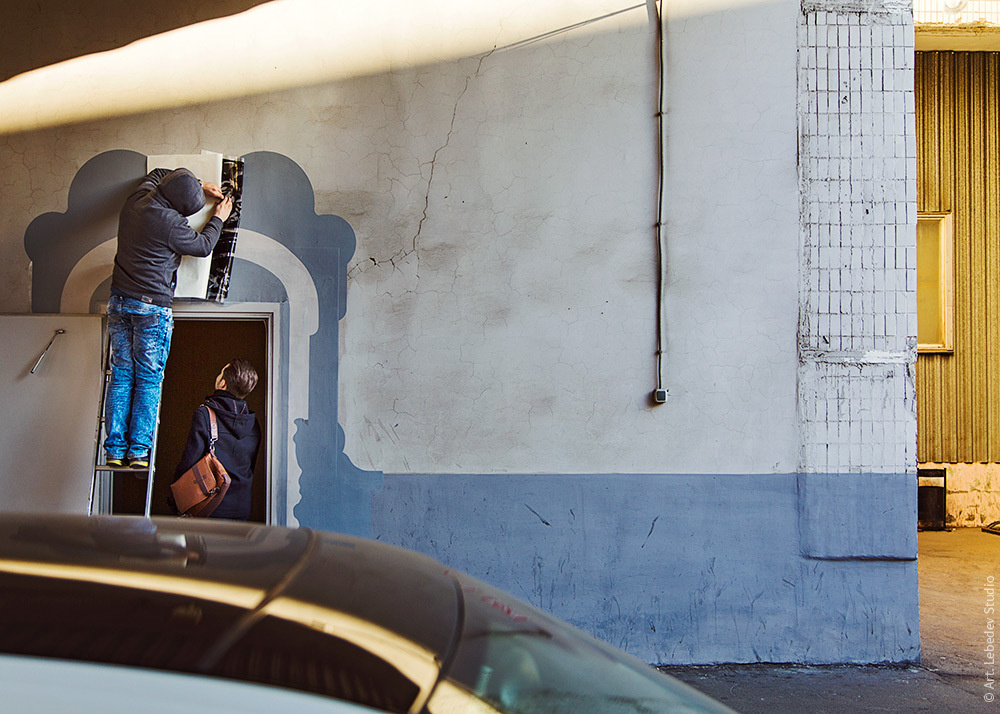 Visualizer Viktor Lvov walks by engineer Vasily Samylkin who is decorating the entrance to the studio.