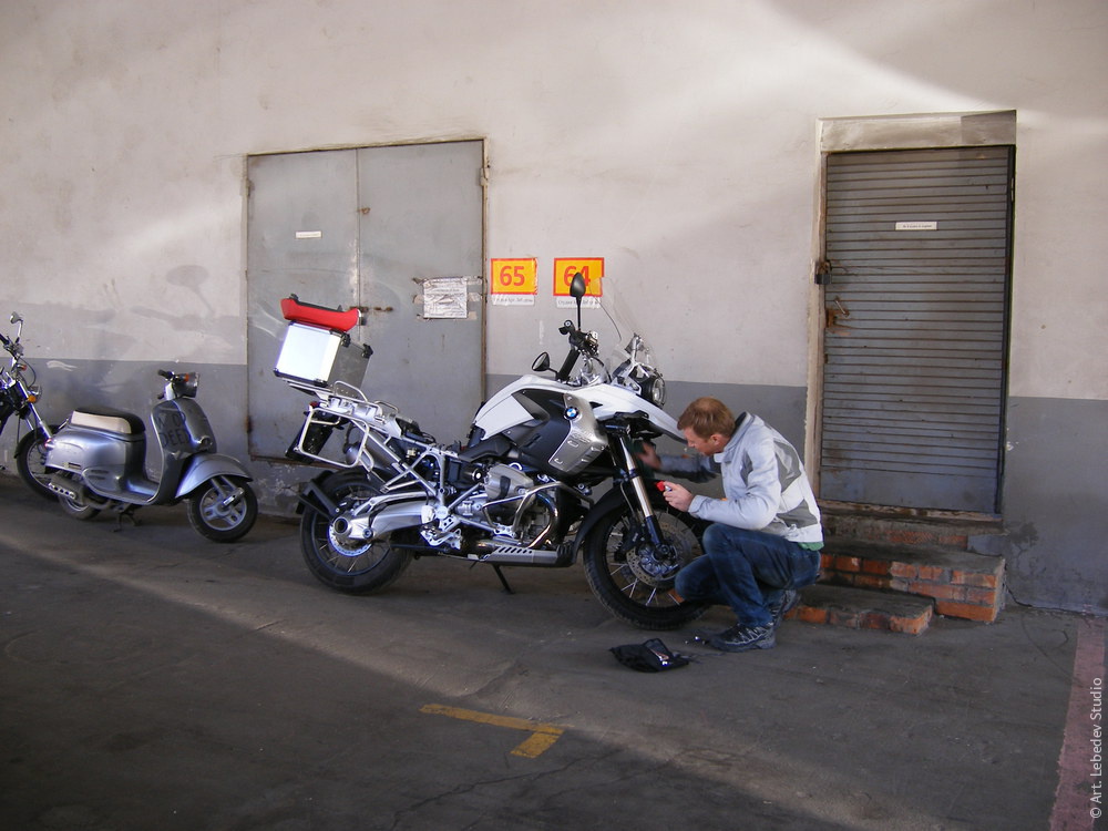 System administrator Andrey Nekrasov polishes his motorcycle.