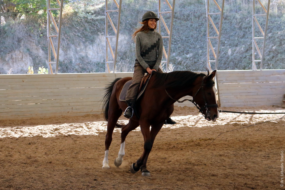 ![]() Manager Anastasia Stupenko takes part in corporate horseback riding lessons for employees of the Kiev office of the studio.