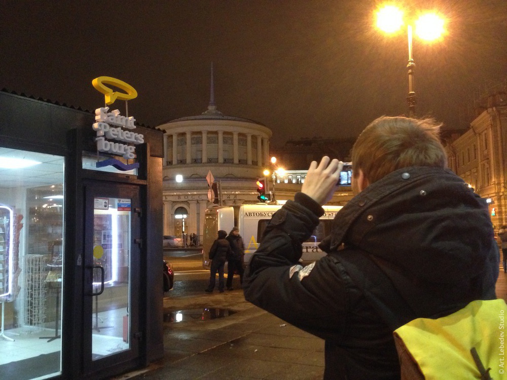 ![]() Designer Mark Rodionov taking a picture of the Saint Petersburg tourist logo sign for Photo of the Day section of the studio’s website.
