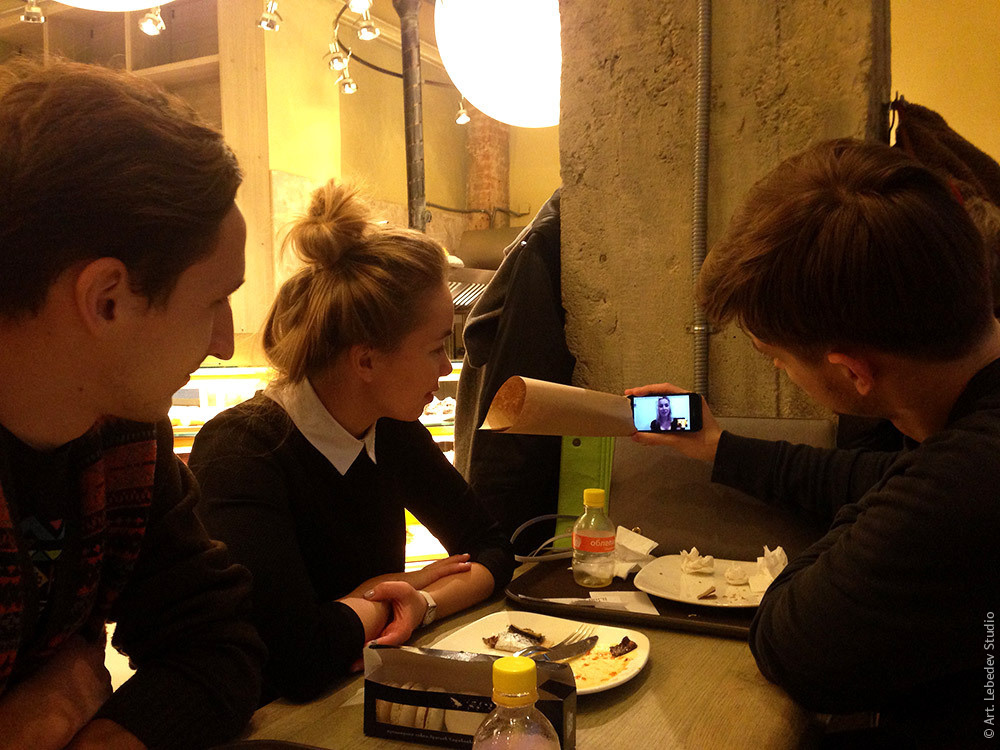 Present and former Art. Lebedev Studio employees video chatting over a lunch break.
