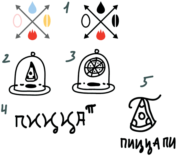 The client doesn’t like the result: too much astrology, alchemy and esoterics. The second attempt, new ideas. Four elements, standards, balance, pizzas inside a word and all that.