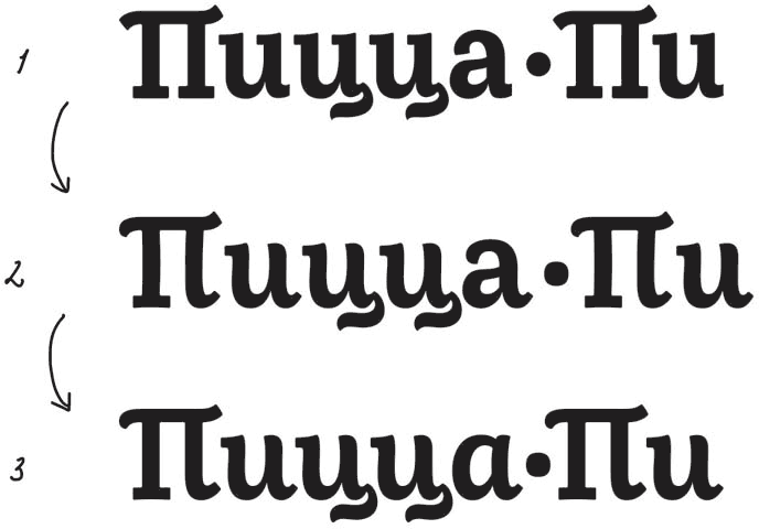 Asking the type designer to polish the letters in the name. Correcting the shapes of the characters. Diversifying the row of similar serifs on top. Paying a bit more attention to the shape of the dot. Now it’s better. But letter a falls out of rhythm slightly, so we draw a circle variant. Placing the letters closer together.