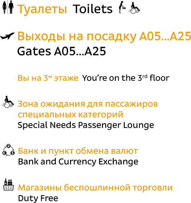 The signs between different levels and parts of the terminal contain additional information on your current location and the location of different objects. Passengers learn whether they need to go up or down straight away.