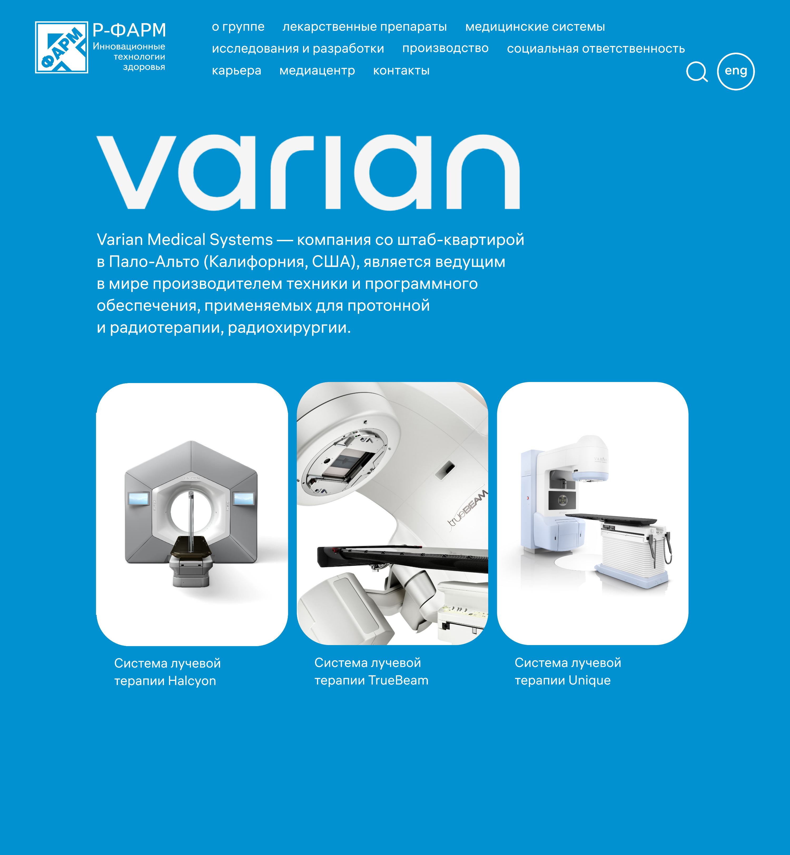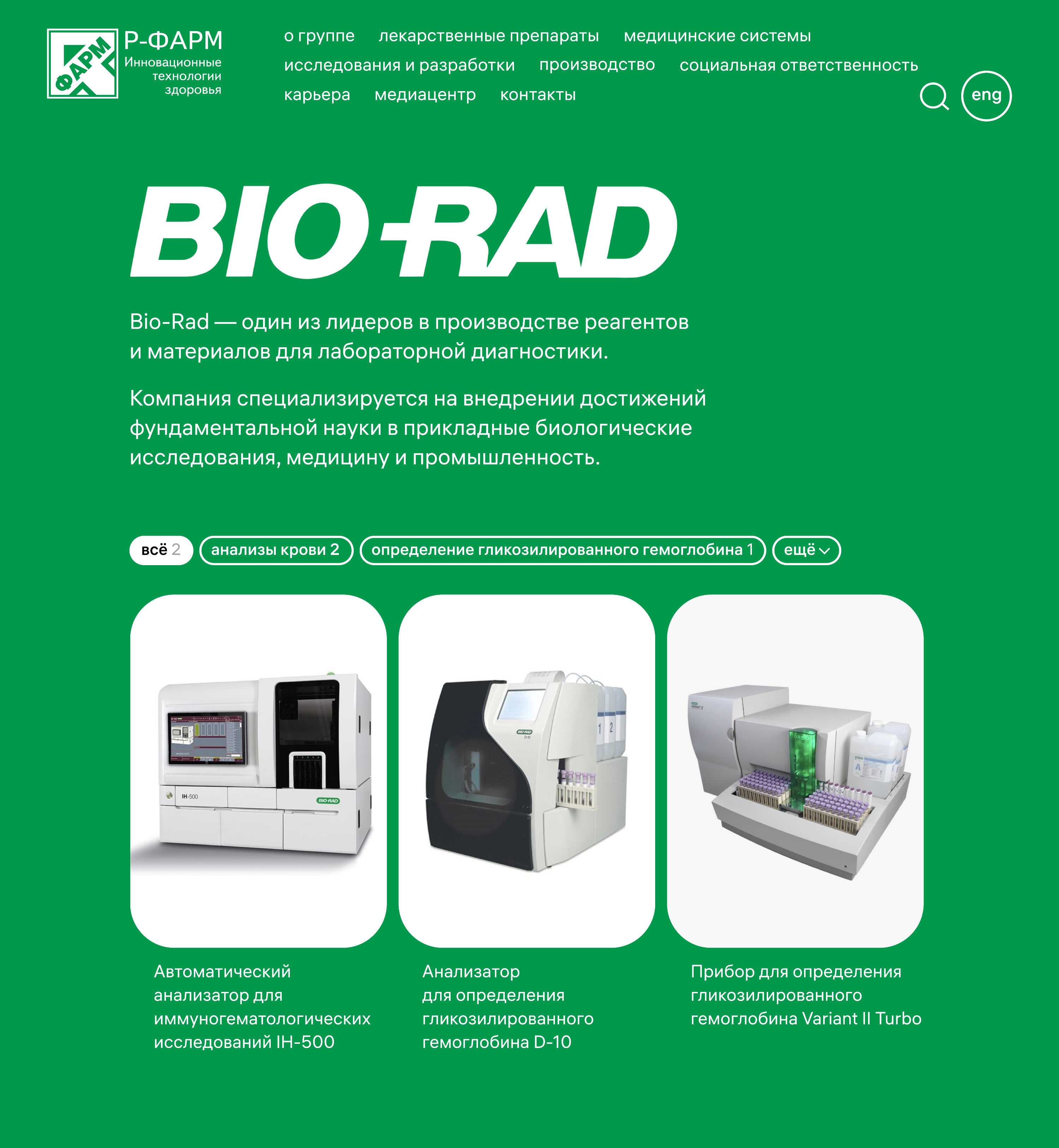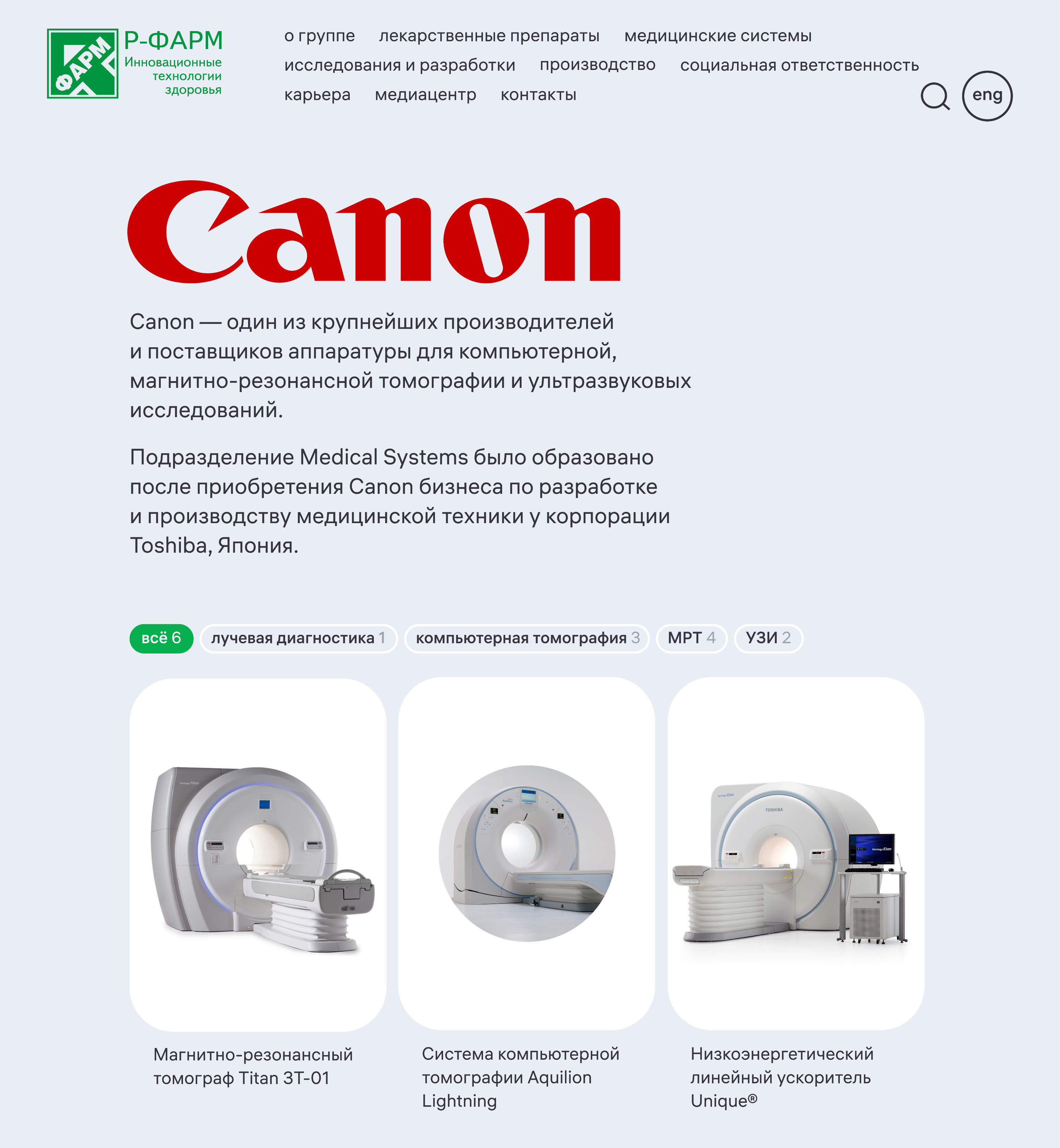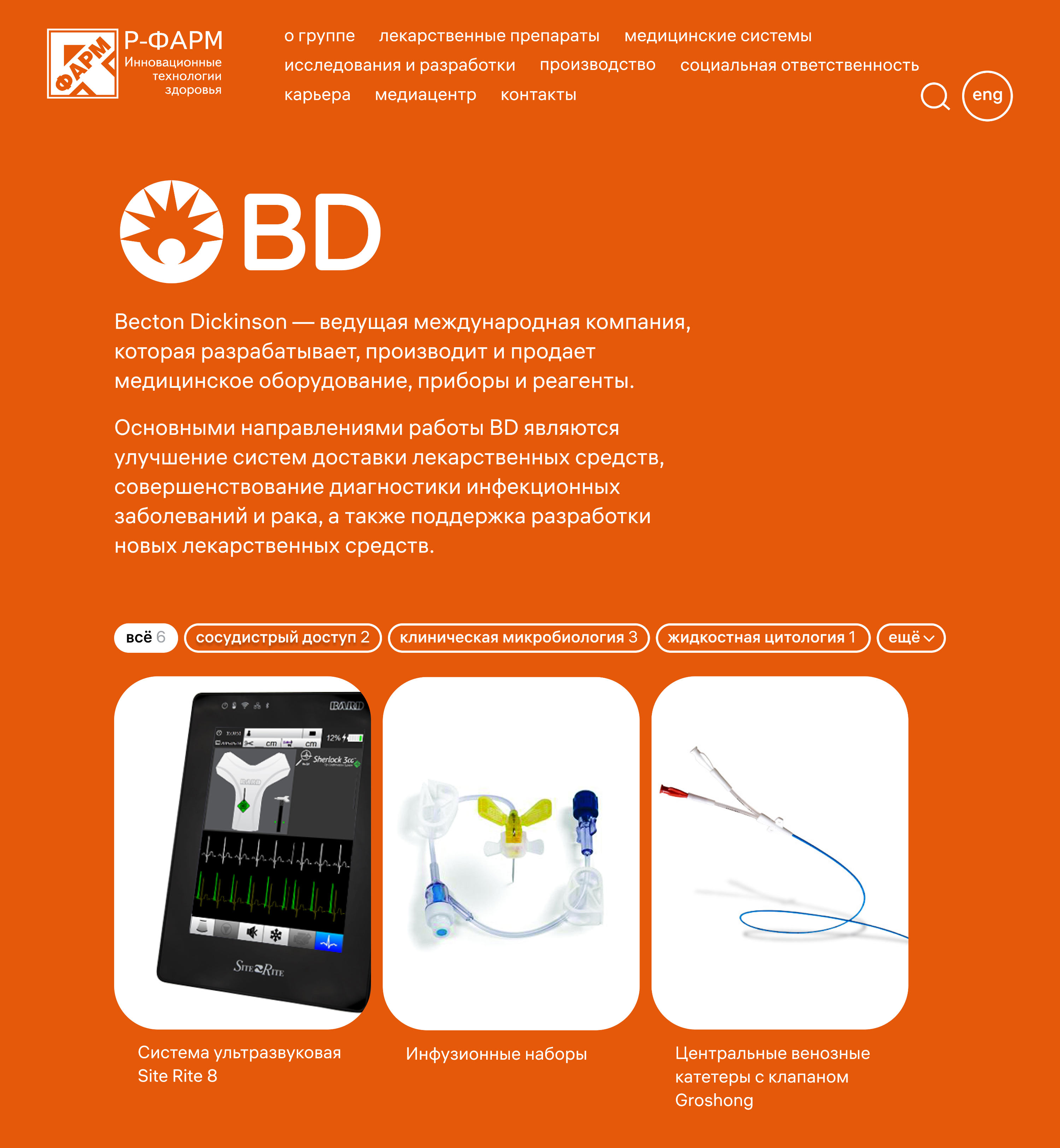 R-Pharm represents well-known brands of medical equipment. They have official pages on the website, approved by each brand individually. If a new brand needs to be added, its page can be easily created and colored in the desired colors.