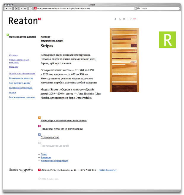 Established in 1988, Reaton is one of Latvias biggest diversified companies. The companys major activities are interiors development and finishing materials sales, food products and gourmet foods sales, construction and finishing works, the manufacturing of doors. The new site contains detailed information on every area of the companys operations. |