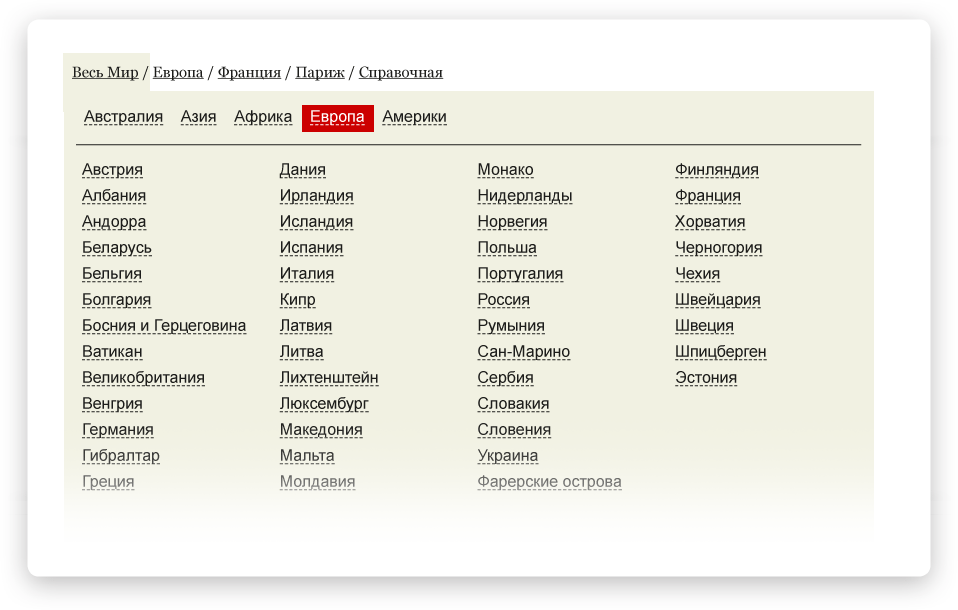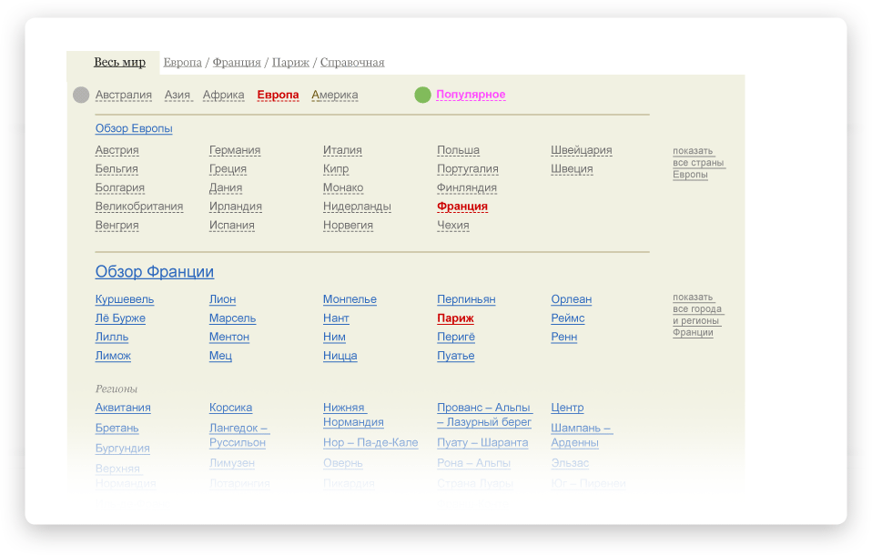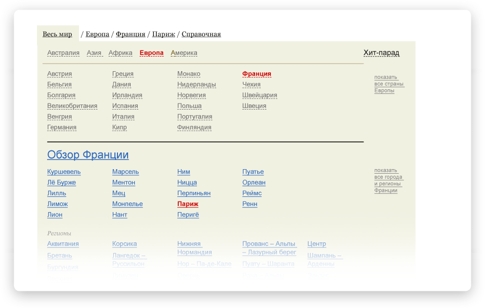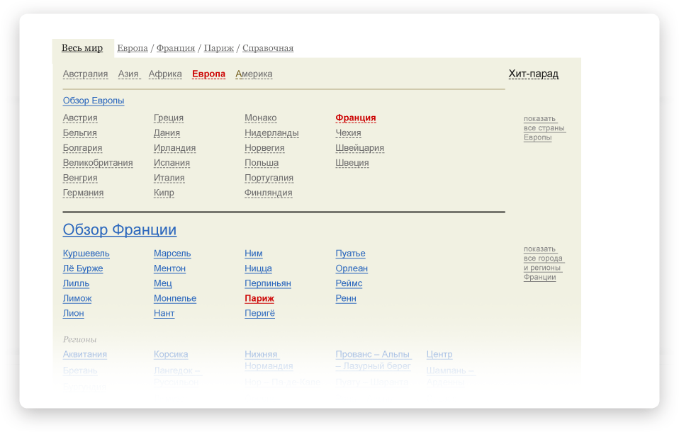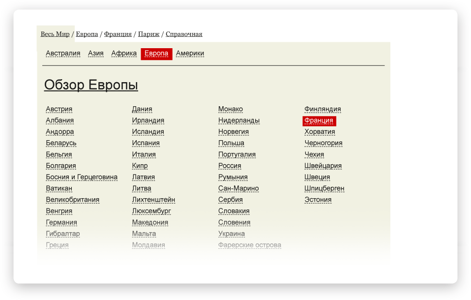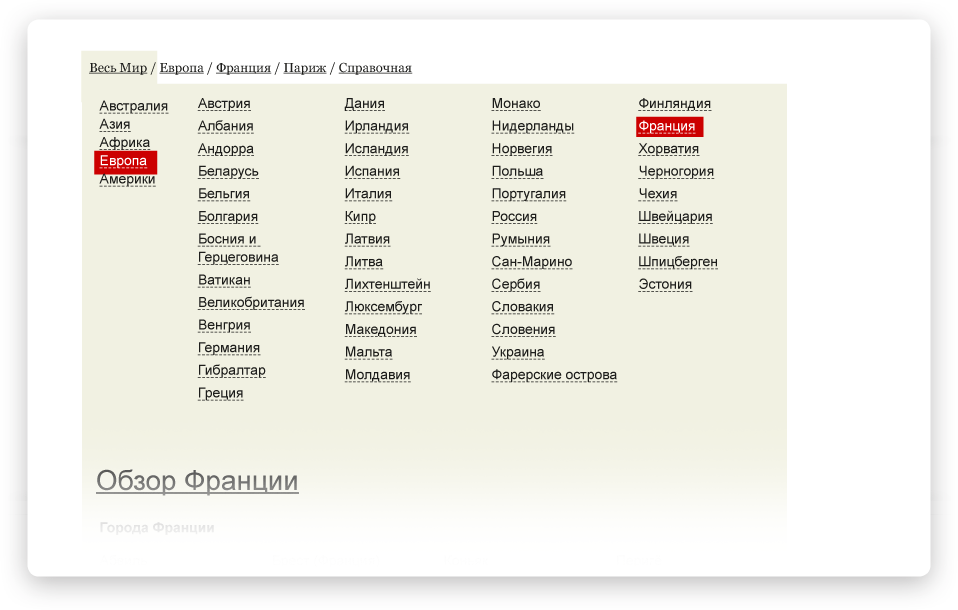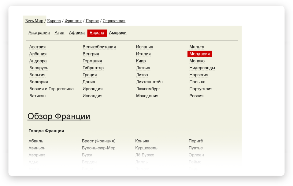 Here you have Africa, Europe, France, Paris. Three clicks without reloading the page is all it takes to move to a different city or a different country.