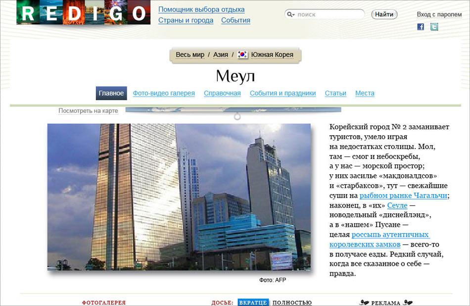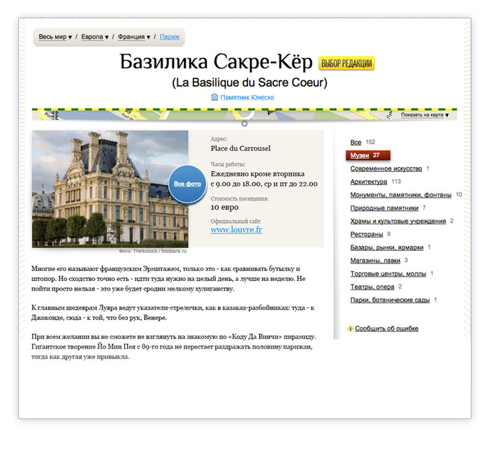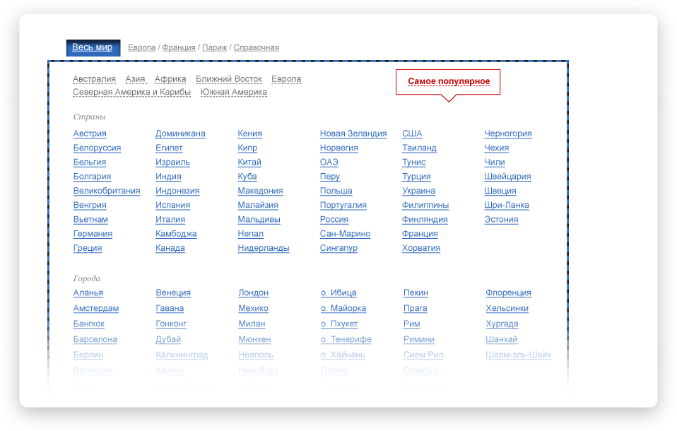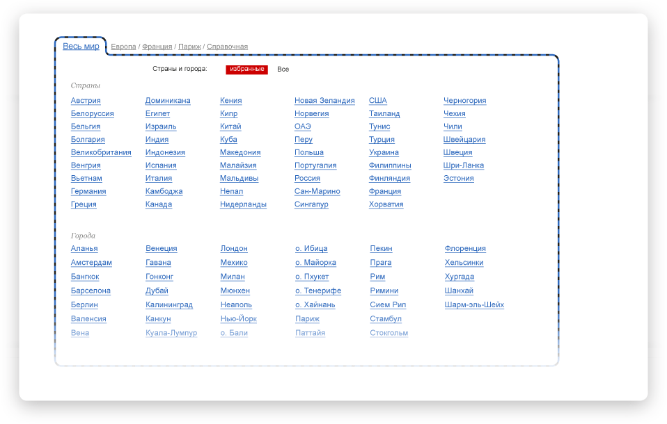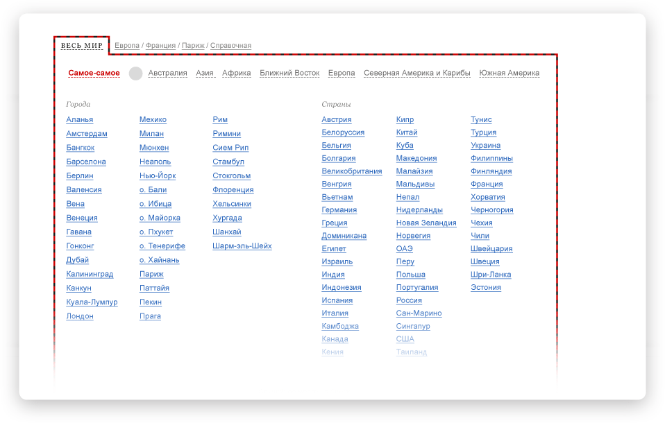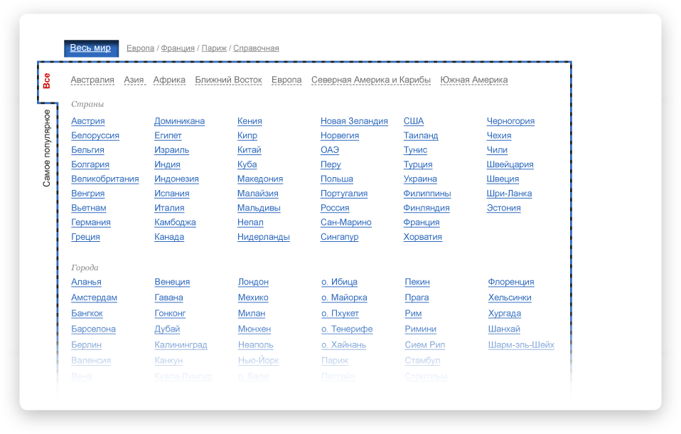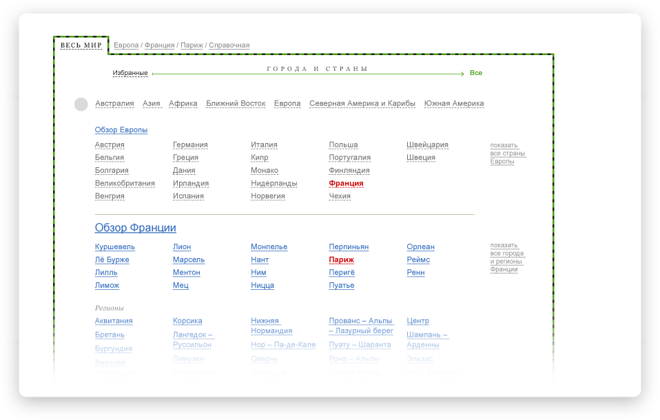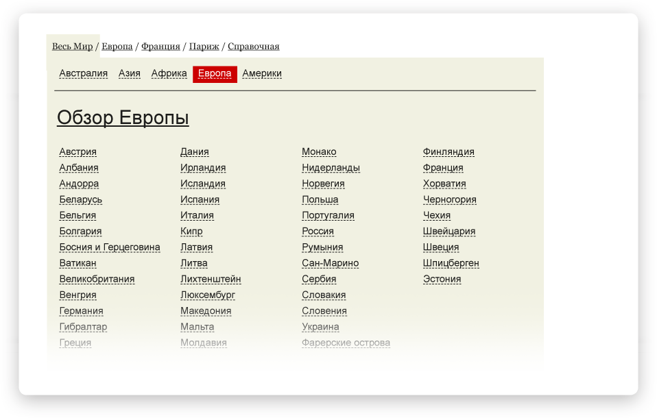Here you have Africa, Europe, France, Paris. Three clicks without reloading the page is all it takes to move to a different city or a different country.