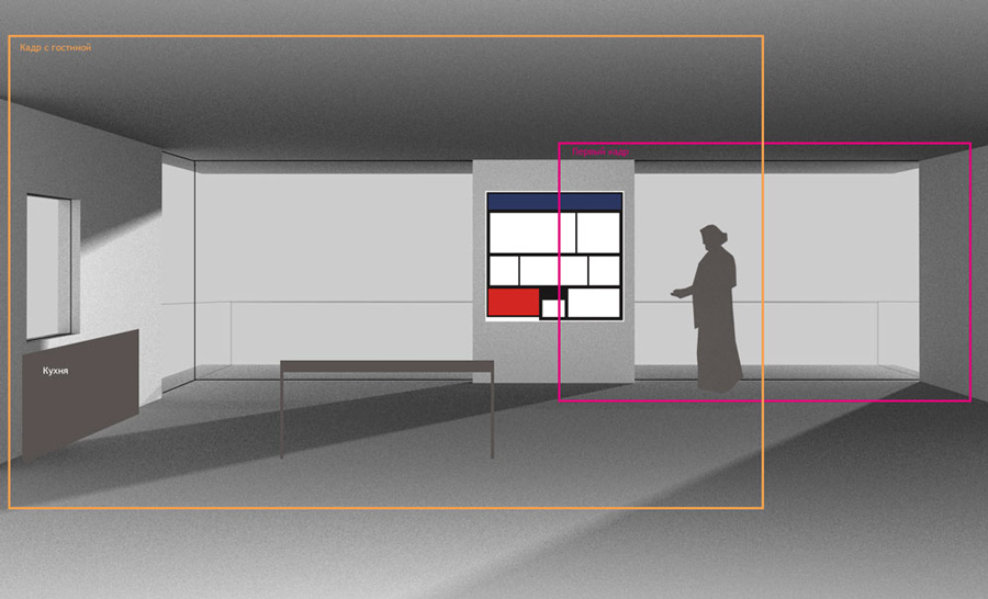 We combined a standard apartment plan and Mondrian’s style to create a painting to hang in the room.