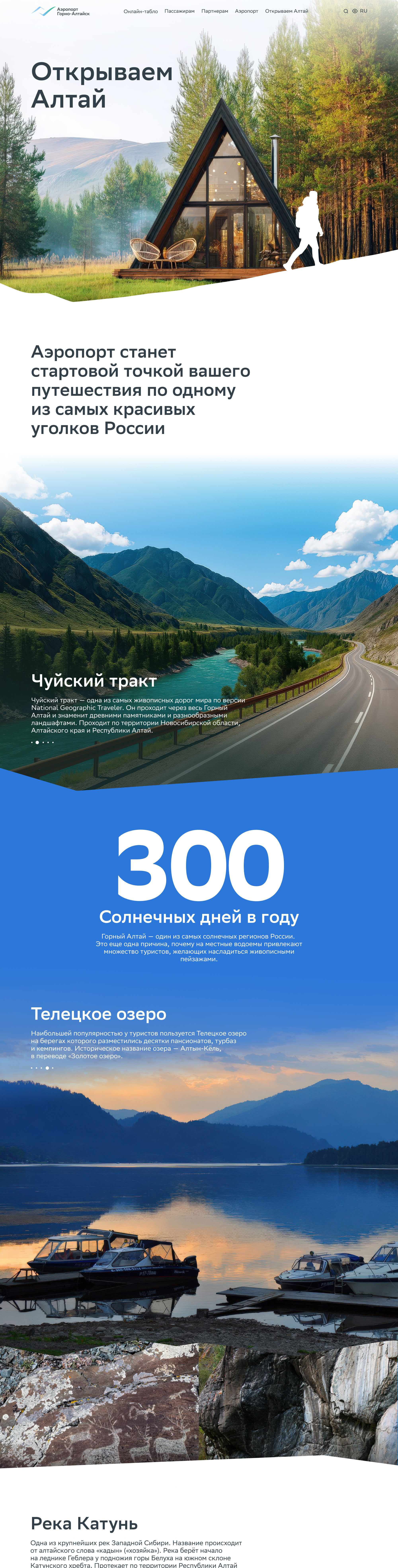 Gorno-Altaysk Airport (part of the Sber group) is a federal-level airport in one of the most beautiful places in Russia — in the Altai Mountains. We designed a website that helps passengers quickly find the information they need and conveys the mood of the region: local residents recognize the beloved silhouettes of the mountains at first glance, while guests anticipate new discoveries.