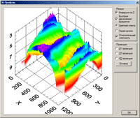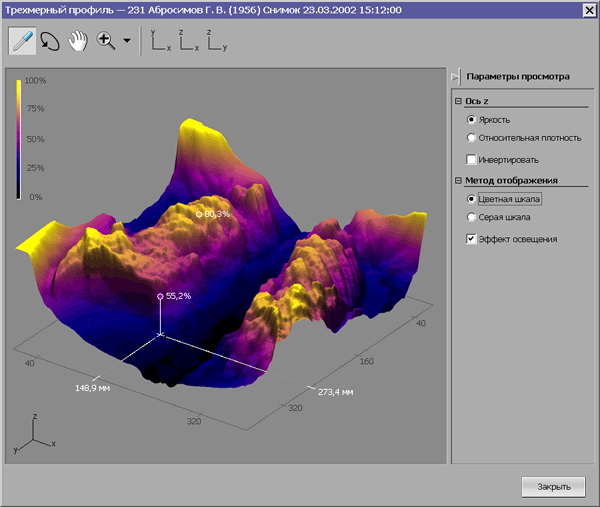 To increase the precision of diagnostics, the doctor can use different diagrams built in two or three dimensions based on the parameters of the original X-ray. In one of the modes a two-dimensional X-ray is displayed as a three-dimensional surface whose third coordinate is brightness. For the visualization of the three-dimensional form, a special color scale (pseudospectrum) coupled with imitated lighting were used. |
