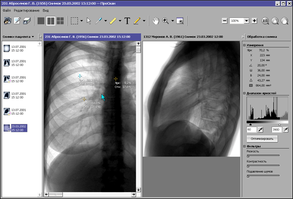 Based on the analysis of the scenarios, we decided not to use the traditional multi-window model for displaying and processing the X-ray pictures (one windowone X-ray). Instead, we used the doctors workplace metaphor. In real life the doctor has a special stand to place one or a number of X-rays for comparison. In the new version of ProScan the doctor is offered three variants of organizing his workplace: one, two or four X-rays on the screen. The doctor can place an X-ray picture from the available list in one of the frames. The X-rays of two different patients with the same pathology can thus be compared, or the patients recovery progress can be assessed by looking at his two X-rays. |