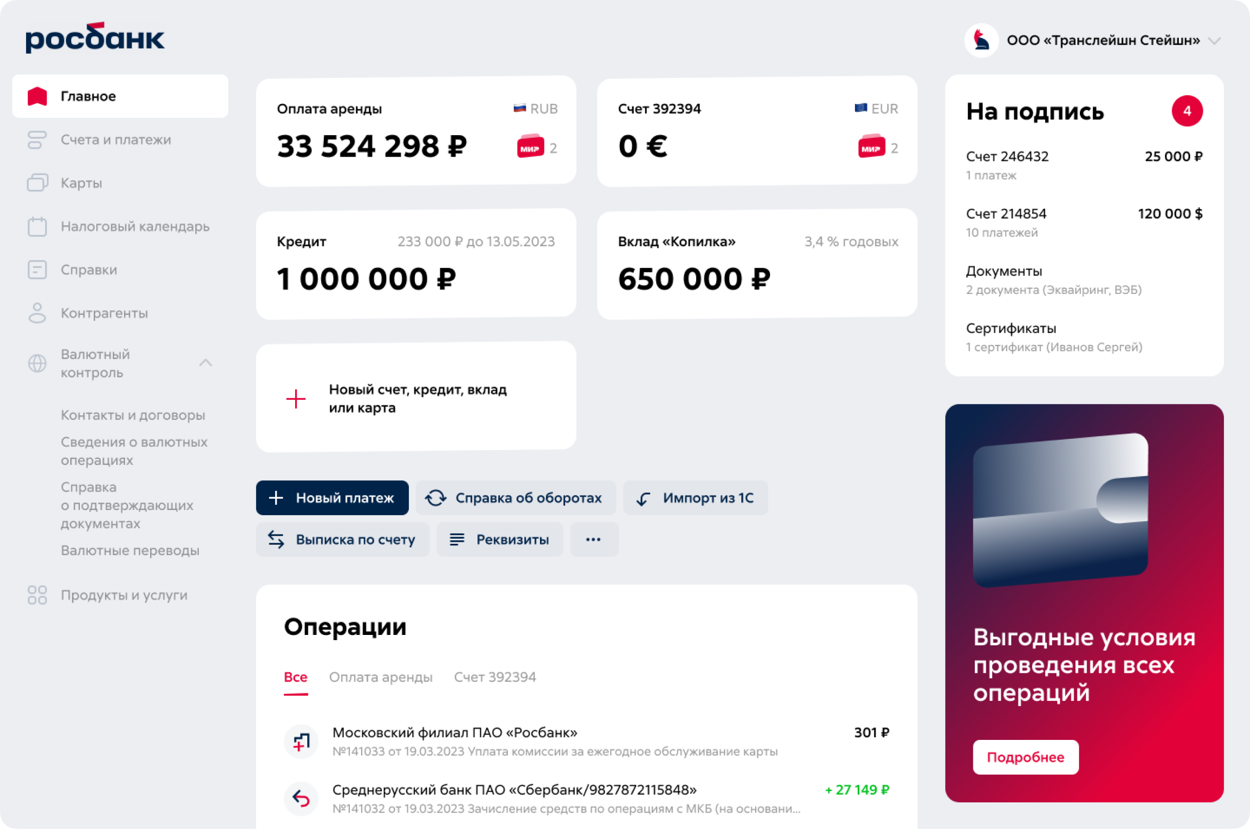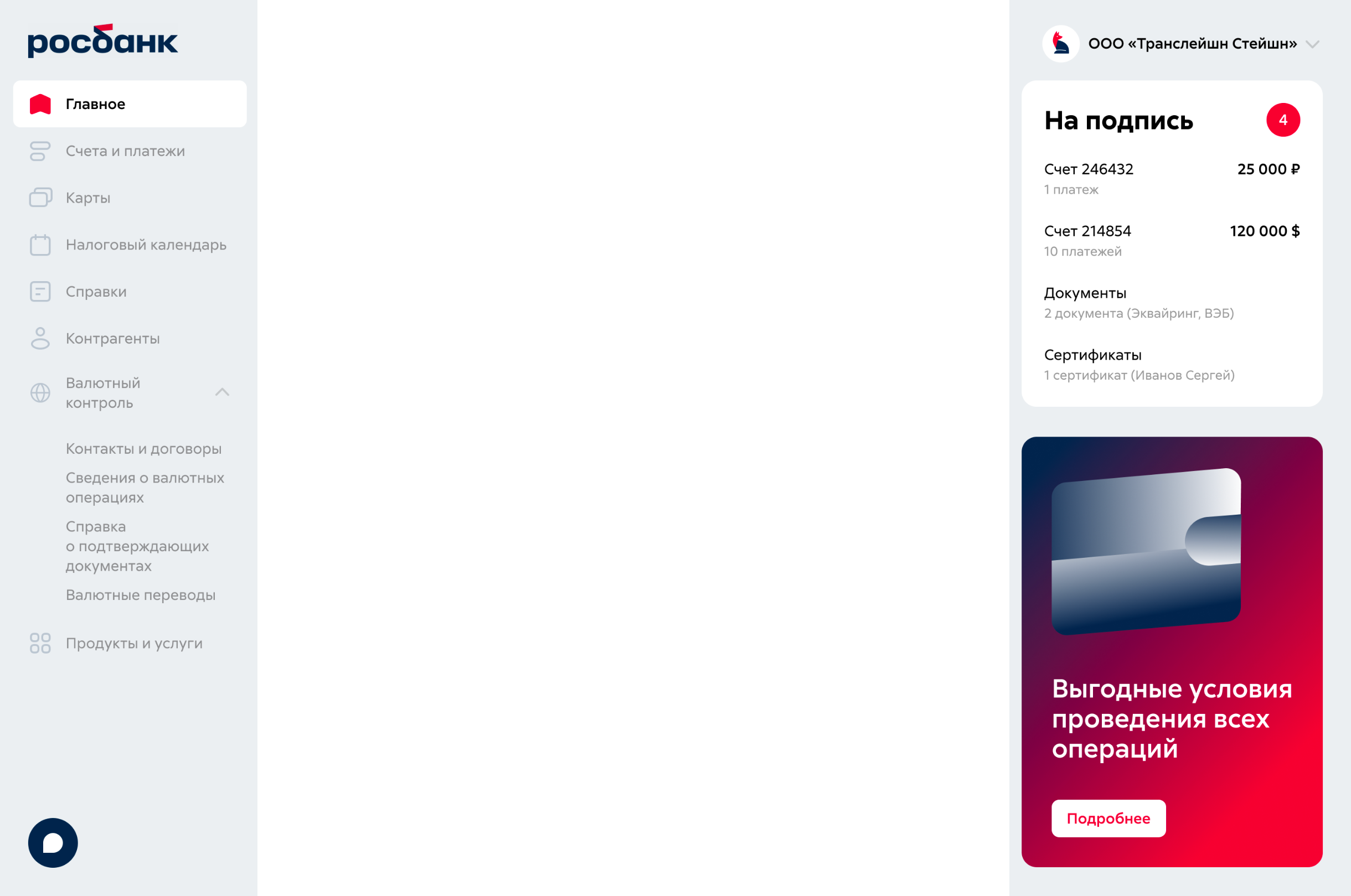 Rosbank account page for small businesses