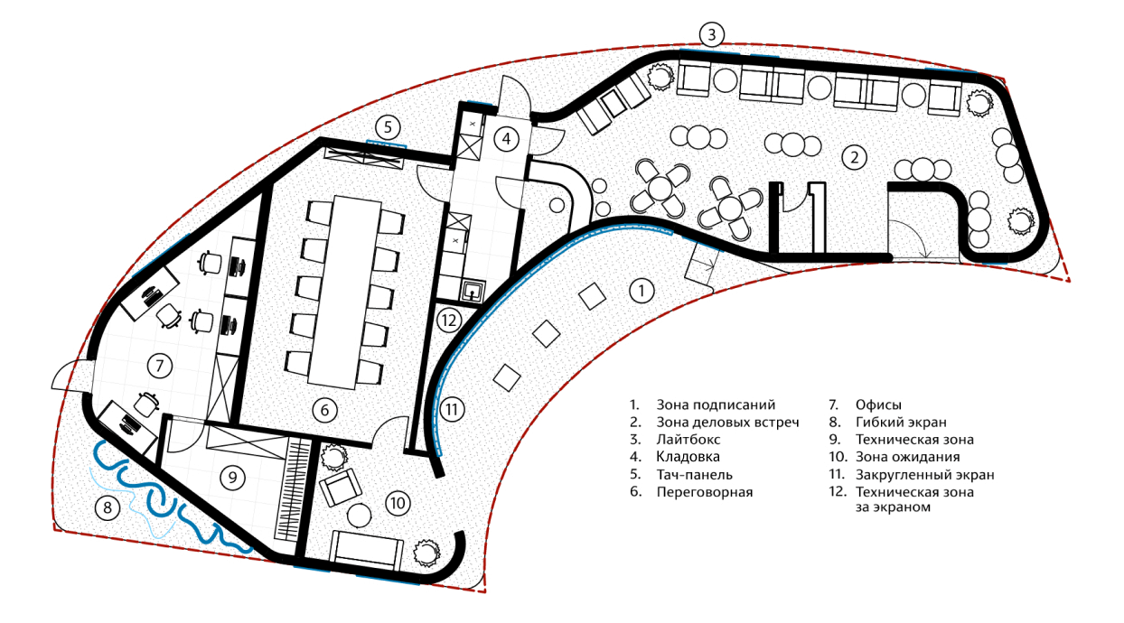 The space consists of multiple zones: an area for signing documents, meeting room, lounge, coat room and even a closet.