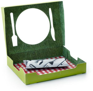 Empty lunchbox. The bottom is covered with grass covered with a table-cloth that can be seen through the plate and cutlery silhouettes