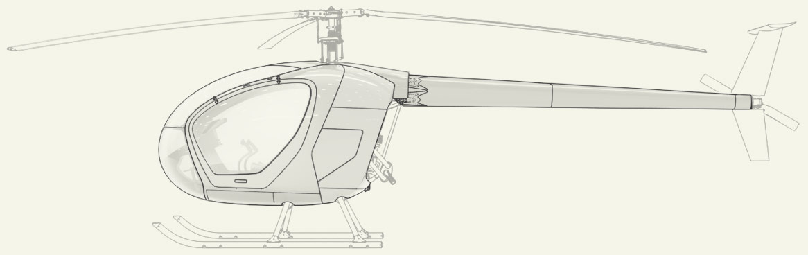 The roof panel and the shell that covers the junction between the tail boom and the framework are joint together, painted in one color and covered with similar finishing, which creates a soft and elegant silhouette of the helicopters windshield, roof and tail