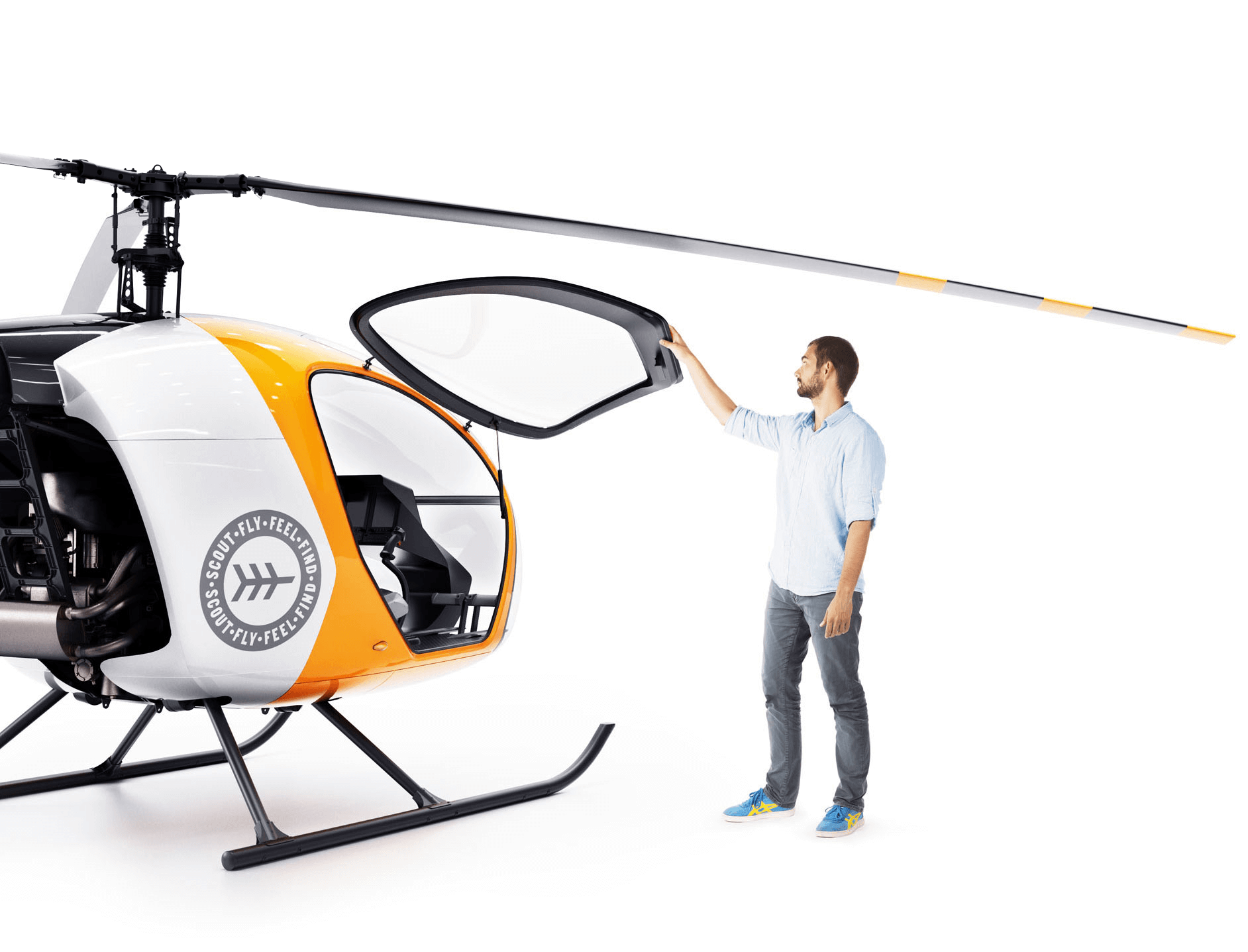 Scout’s dimensions are close to traditional two-seat helicopters, yet it can easily carry three people with luggage.