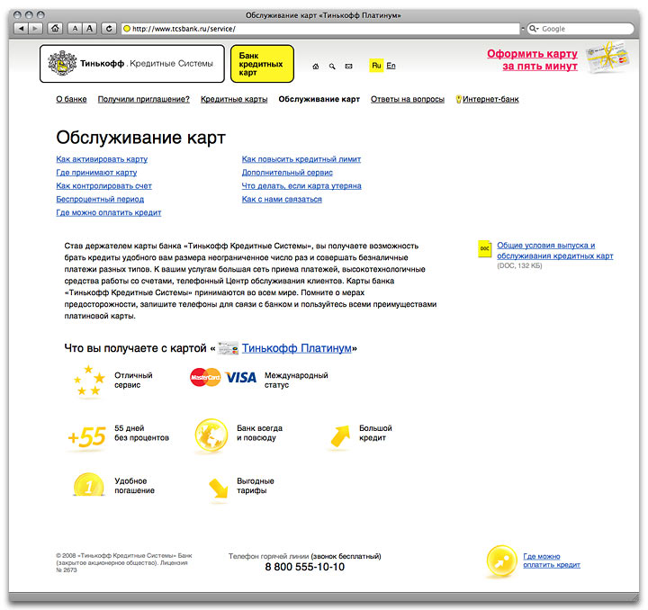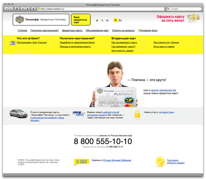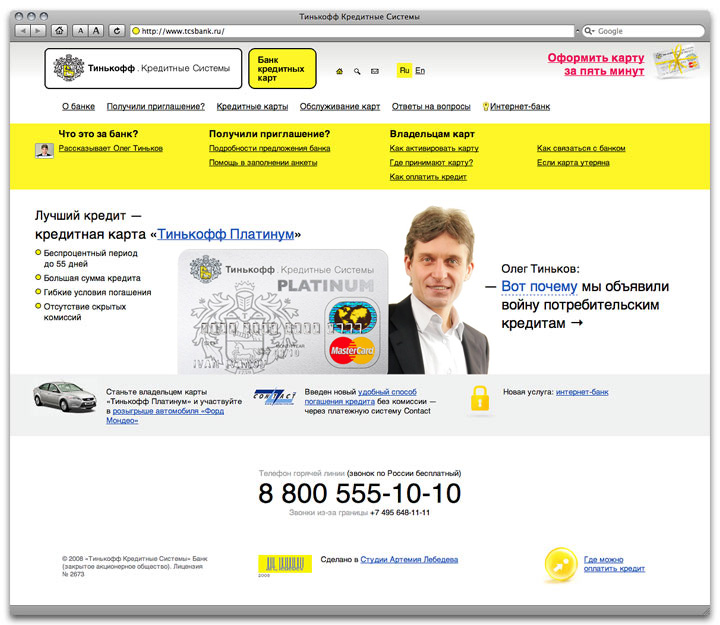 Tinkoff Credit Systems is a credit card bank. It offers new approach to client servicing and supportcommunication is done entirely via mail, by phone and through the Internet, and there are no real offices, desks or ad stands anywhere. The site tells people how and why it works. A bank with a human face To obtain a card you need to fill out the form you receive by mail. Many seem to get confused over it. On the site, there is a separate page explaining how it should be done, so less questions can be asked over the phone and less mistakes occur. If you need the card but the bank sent you no letter, you can order it online. |