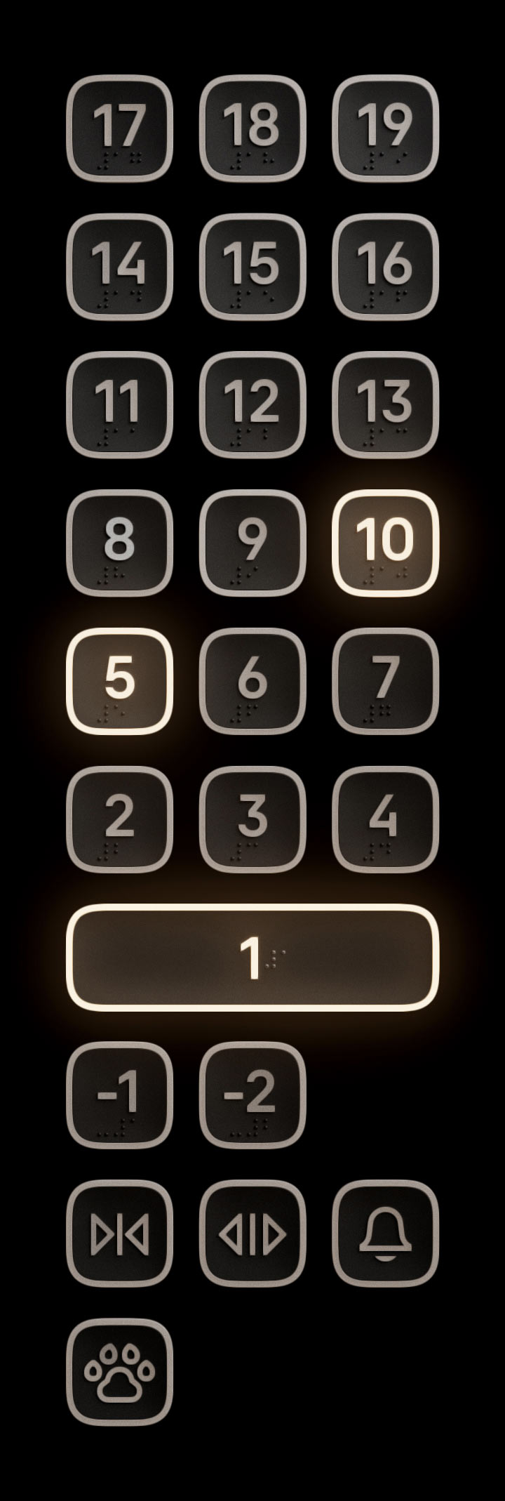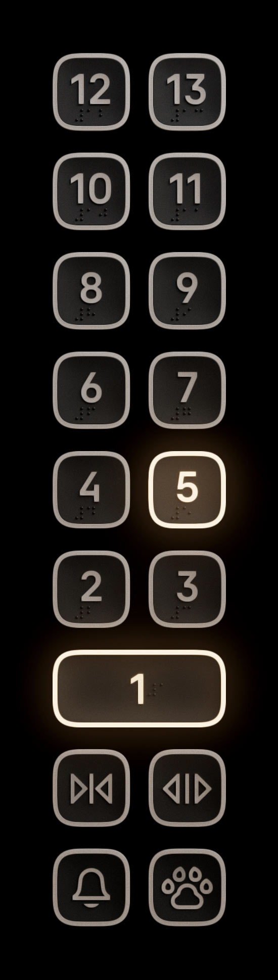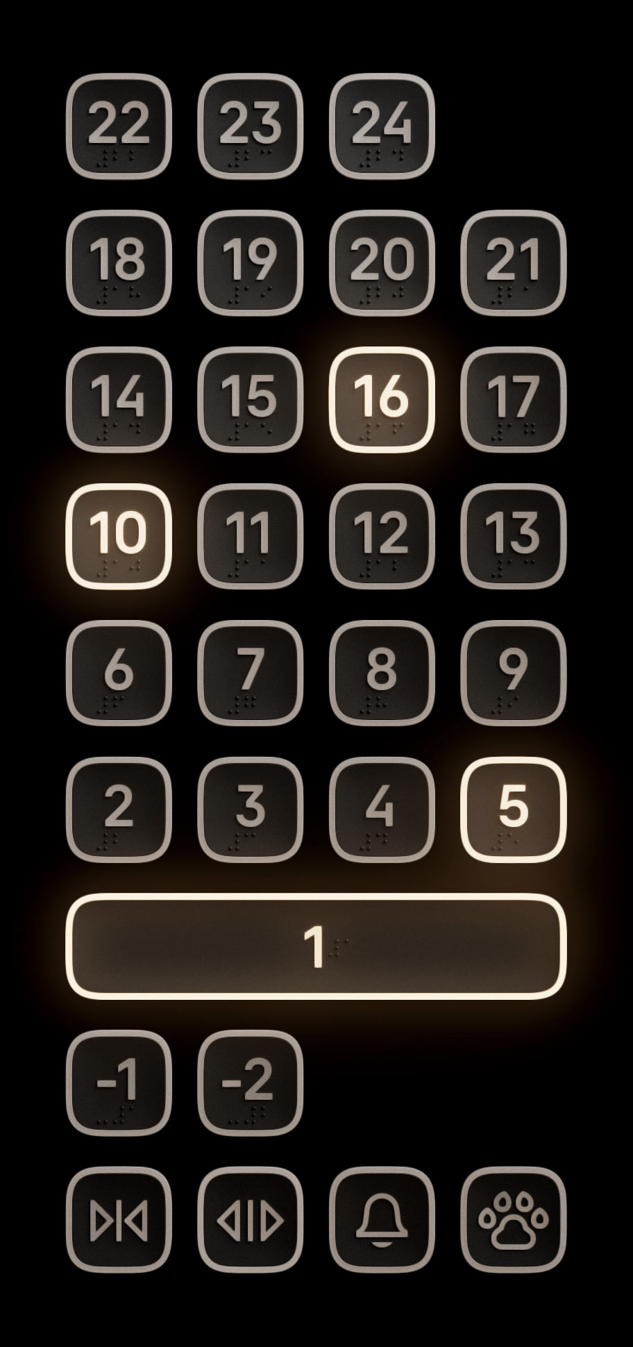 The buttons are arranged in an elegant and intuitive grid. The most important button—the first floor—stretches across the entire row. On one hand, this creates a necessary additional accent and on the other hand, it serves as a clear separator between above-ground and underground floors.