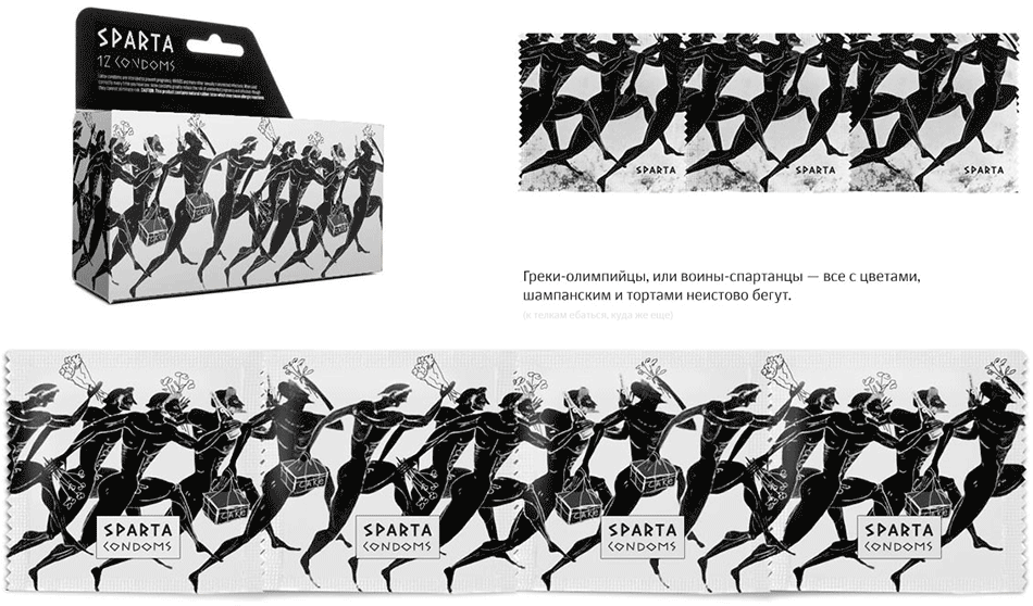All right, let’s start. We need to create packaging for condoms named Sparta. The image comes to us right away: Greece, horses, vases, running men. A picture is born: a bunch of ancient dudes with clay crocks possessed with lust are running to make love.