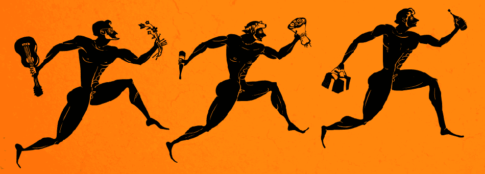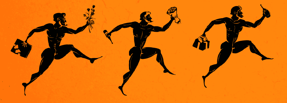 The client chooses the runners. Fine. Let’s go on. Inviting the illustrator to join us. Her task is to draw cool Greek dudes, just like on antique vases.