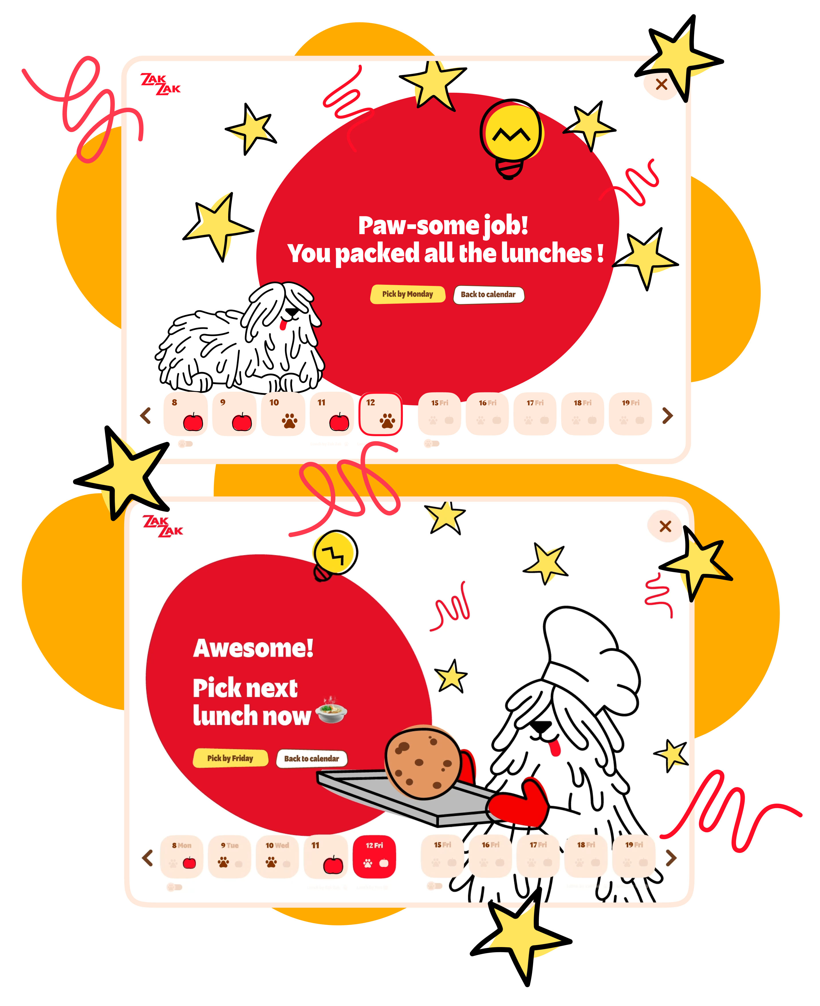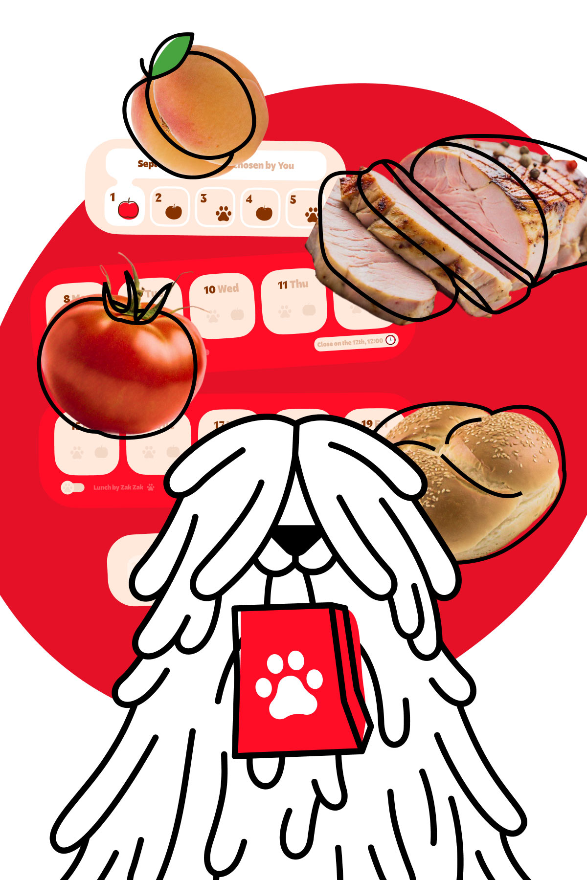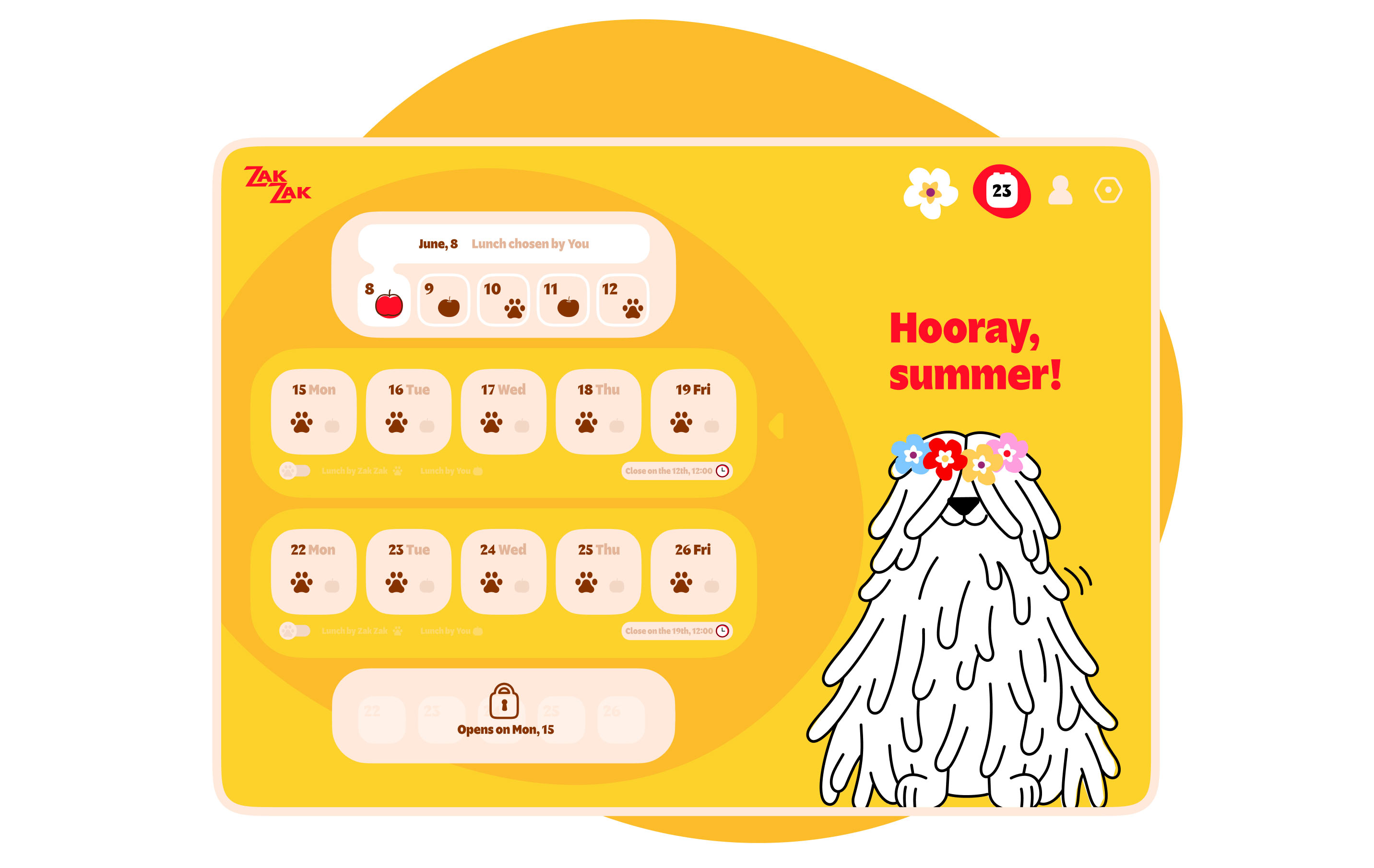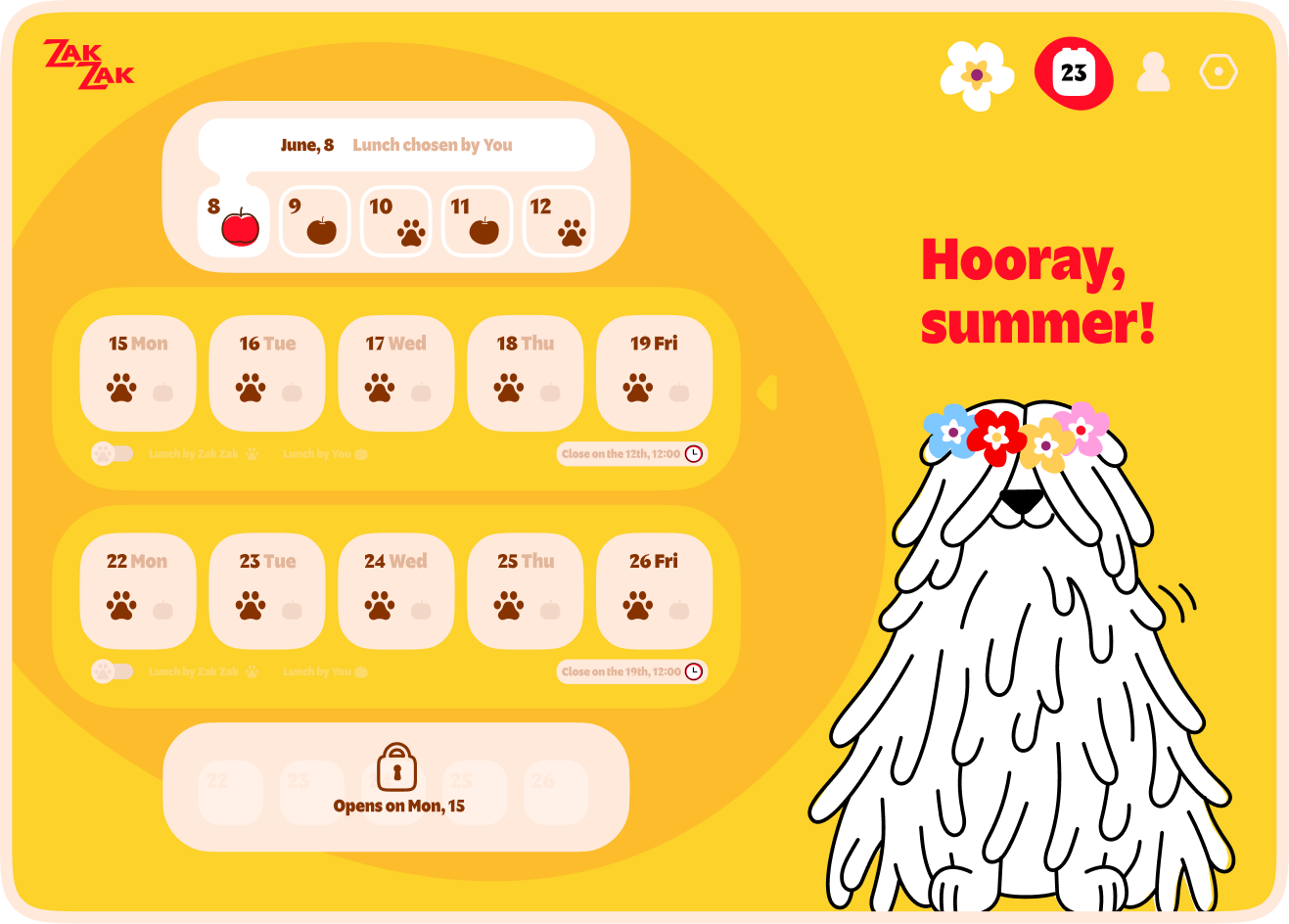 By selecting a pre-made lunch, the user assigns a menu recommended by the company’s specialists for a specific day. This menu is presented in the interface as advice of the friendly mascot Zak-Zak and is marked with a paw print.