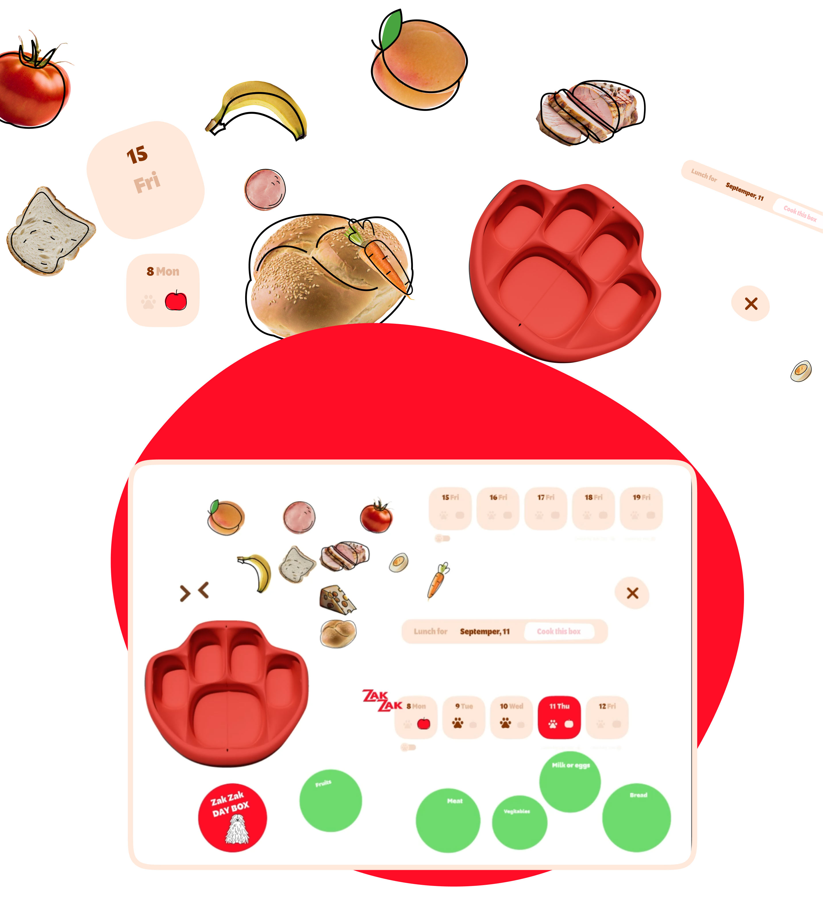 A combined option is also available: a user can start with a pre-made lunch and then swap out individual components based on taste preferences. These days are marked on the calendar with two icons.