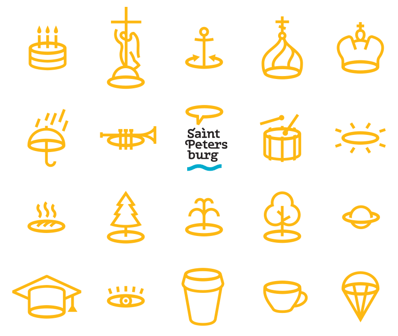 An entire set of symbols reflecting exciting, pleasant and unforgettable aspects of Saint Petersburg life were created. Each one is a clear and expressive symbol with an ellipse at its core. |
