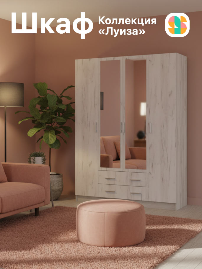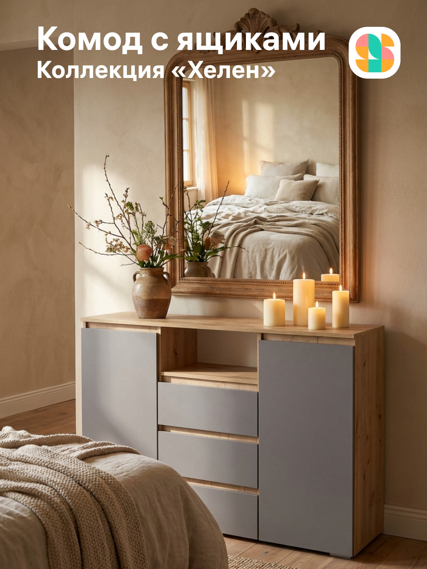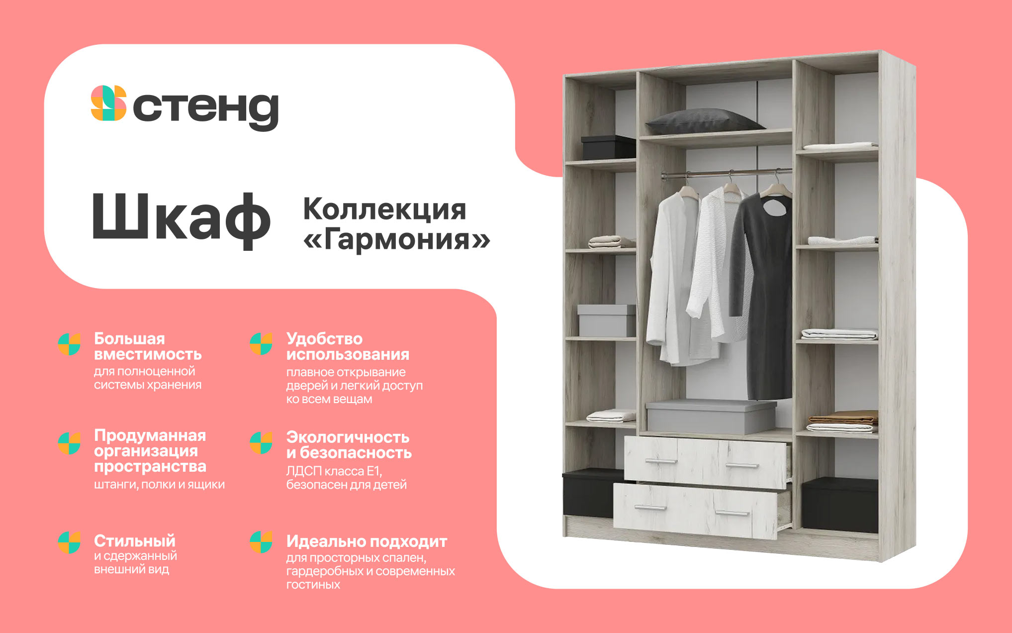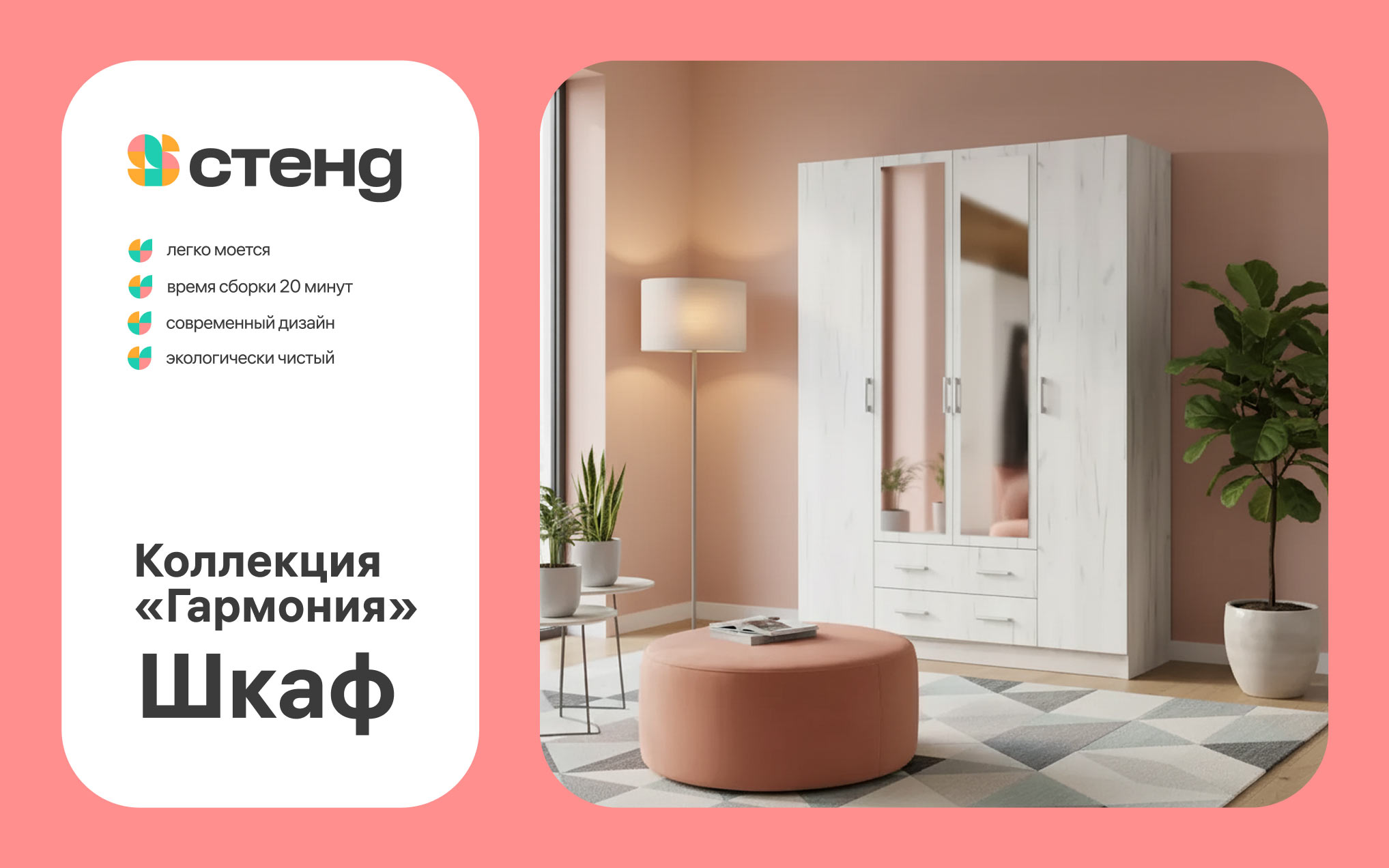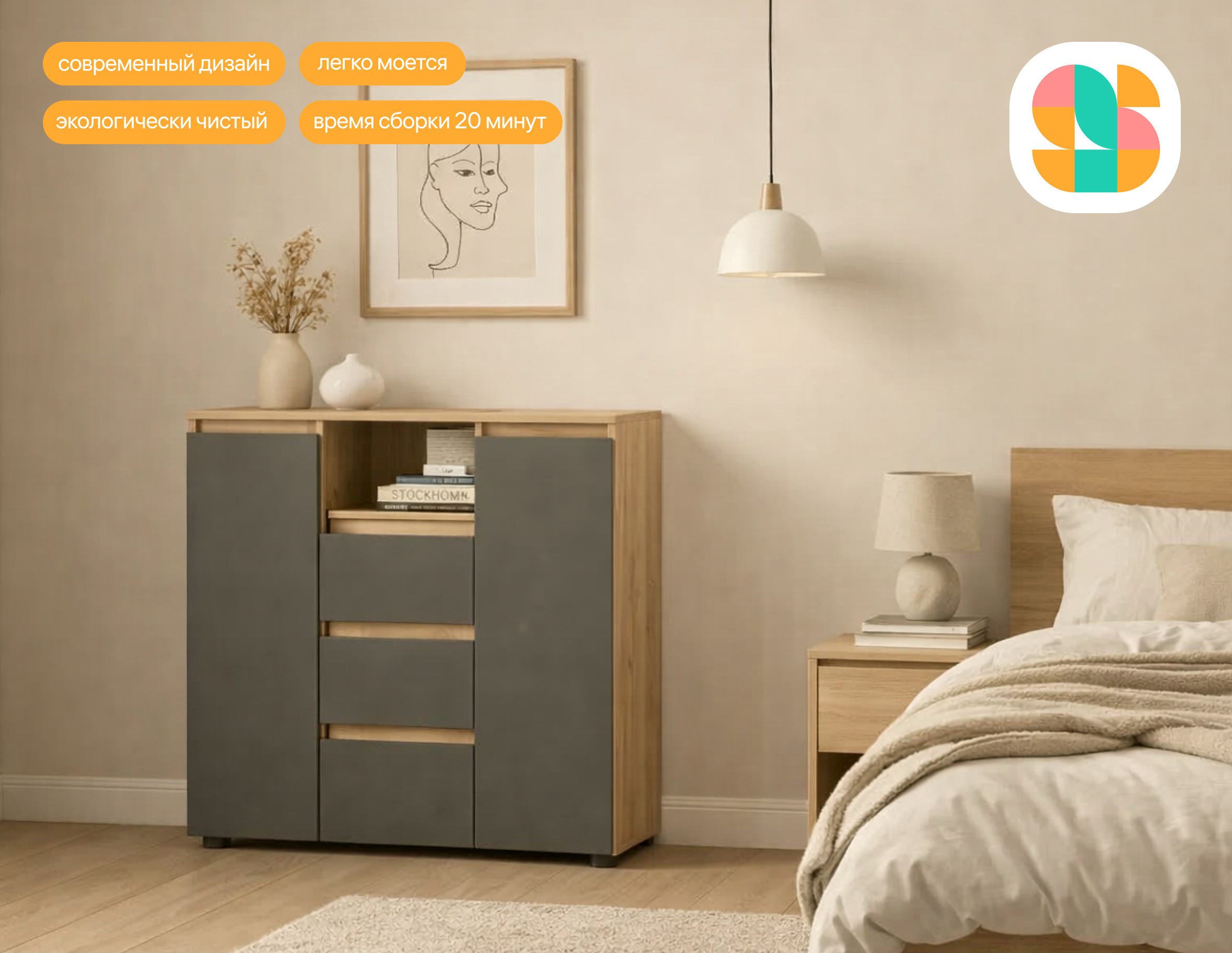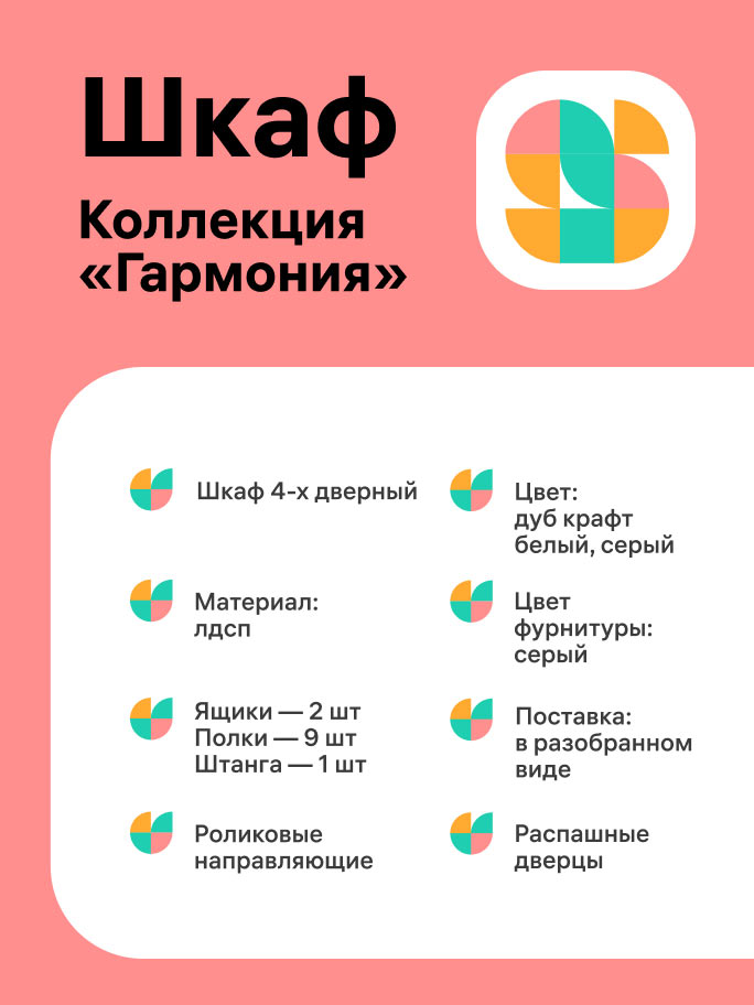 In the multicolored geometric symbol, the outlines of two versions of the first letter of the name are combined — the Cyrillic S and the Latin S. The sign is constructed from abstract elements that resemble pieces of furniture. The semicircular joints refer to the aesthetics of furniture blueprints and the shapes of fastening components.