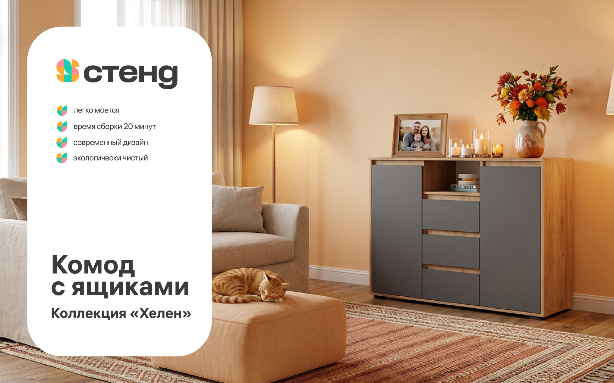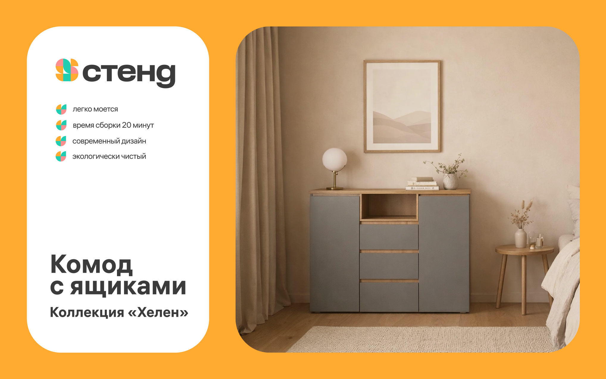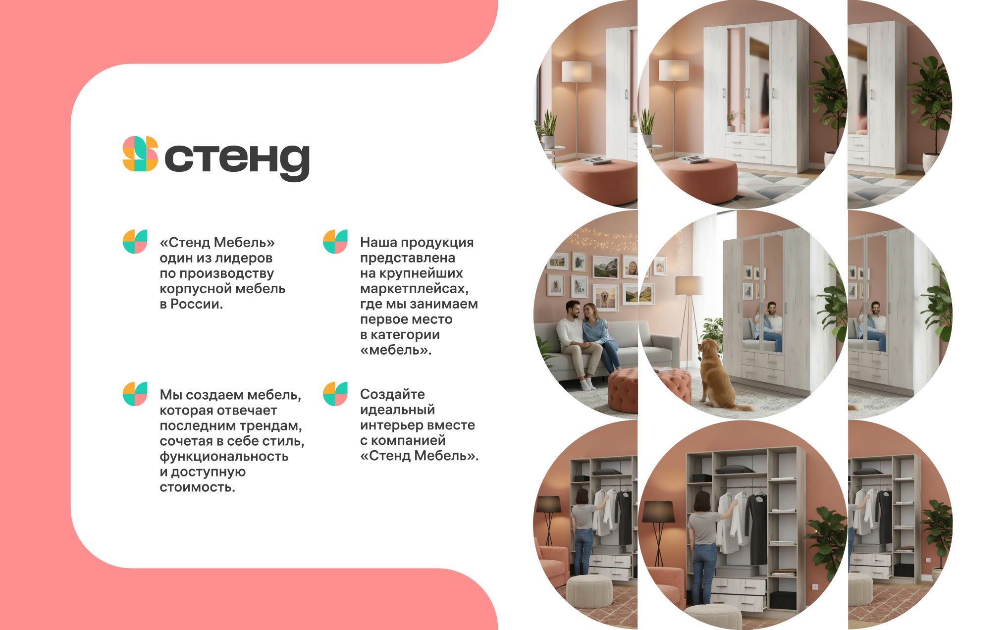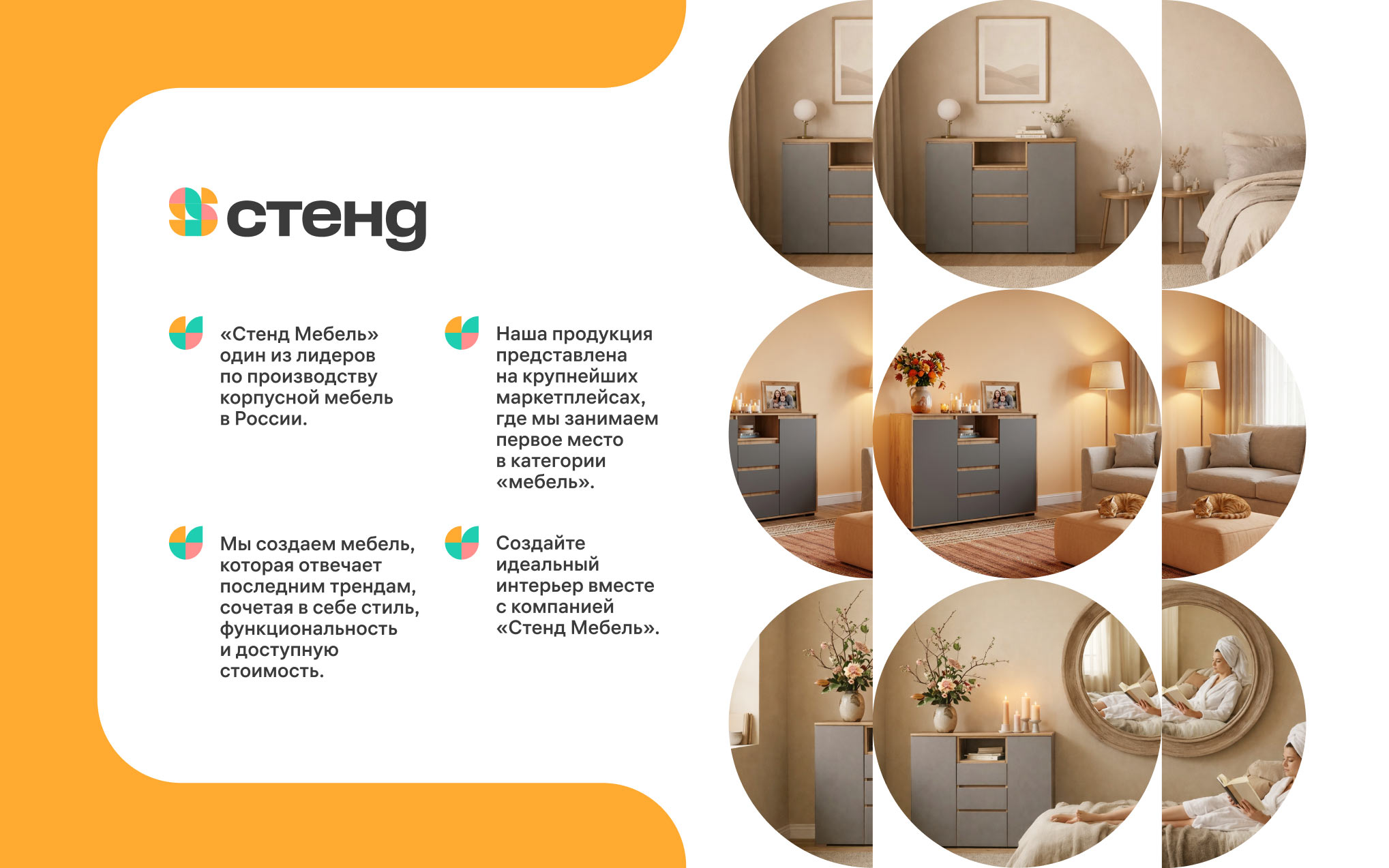 “Stendmebel” is a leading Russian company from Penza with a 15-year history. The company’s specialization is mass production and sale of modern furniture sets and individual interior items. Trendy Penza furniture is sold in retail chains throughout Russia and is showcased on the largest marketplaces. In the studio, a calm and soulful brand identity was designed for Stendmebel.