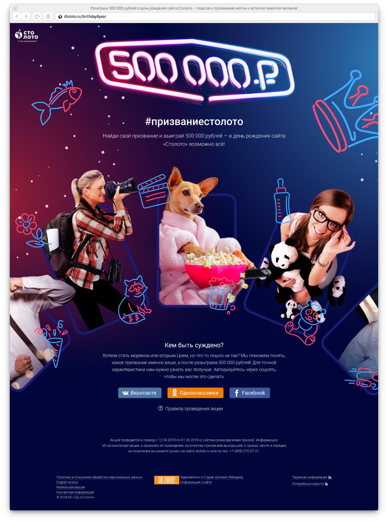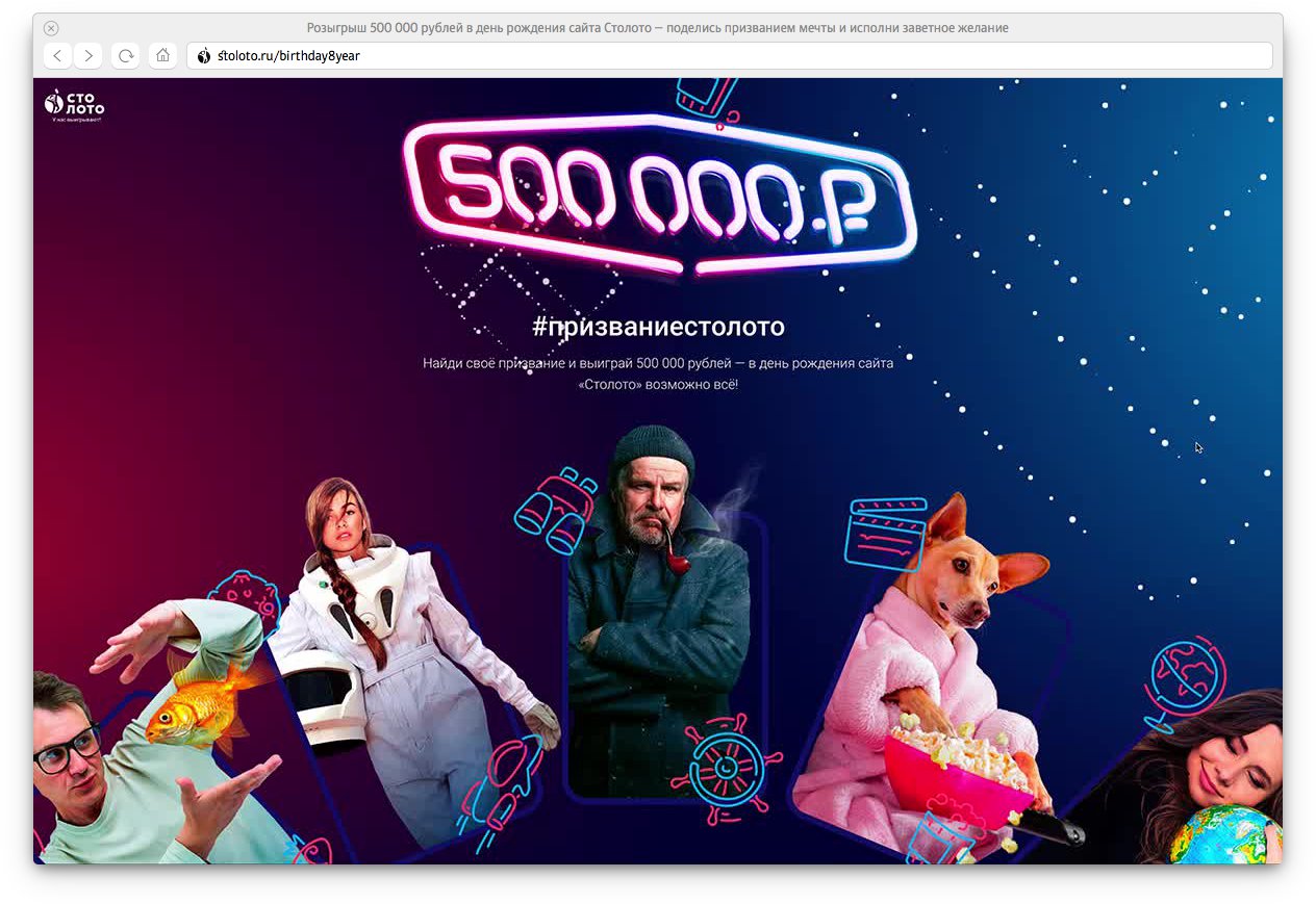 The anniversary of the Stoloto website happens to fall on the Cosmonautics Day. To celebrate both holidays, Stoloto will hold a super draw of a 500 000 ruble prize. A space-and-birthday-themed page for the country’s main lottery website was designed at the studio.