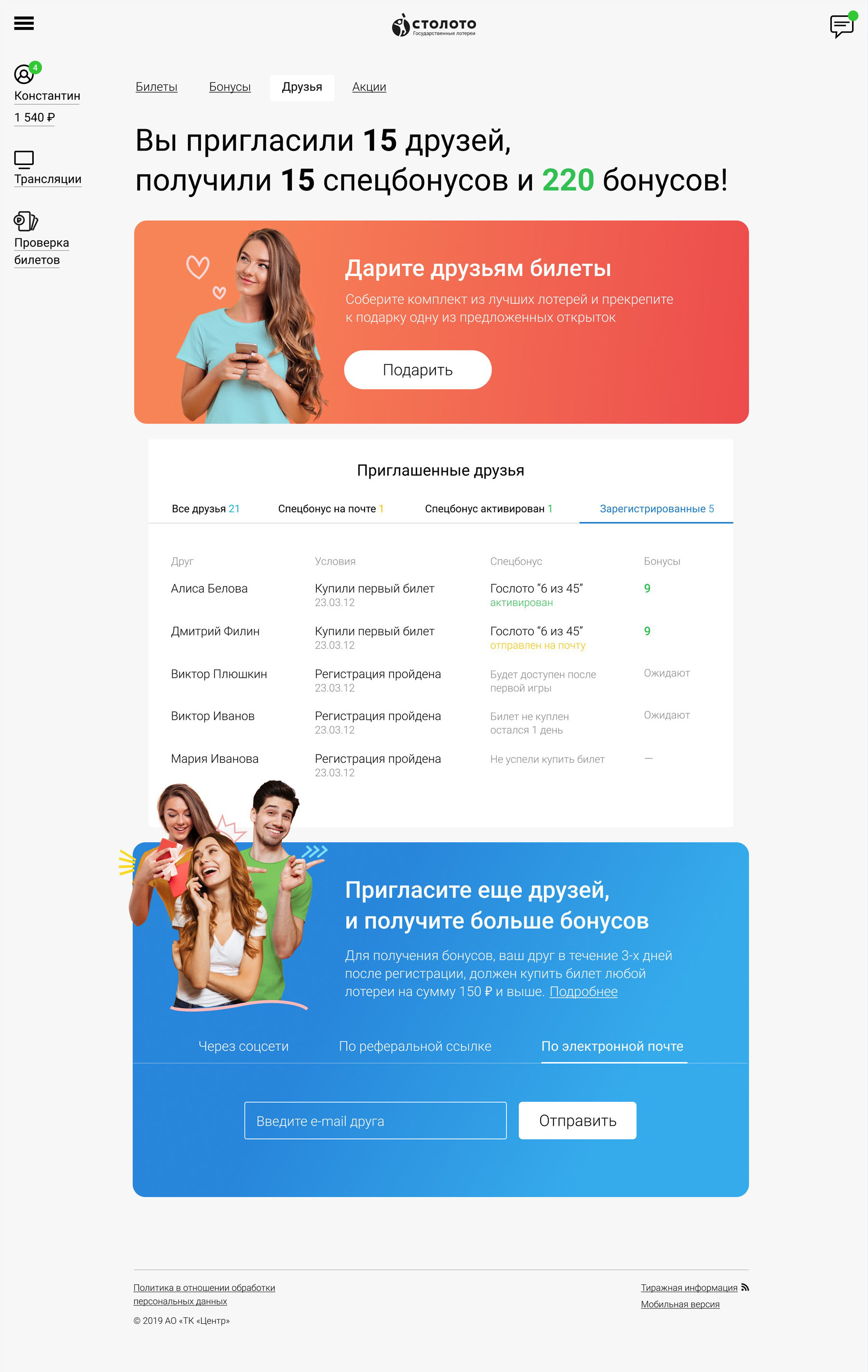 The Friends tab on the personal account page allows to invite friends and give them gifts. It also shows all the stats: how many friends have registered through your invitations and how many bonus points and special points you have accumulated.