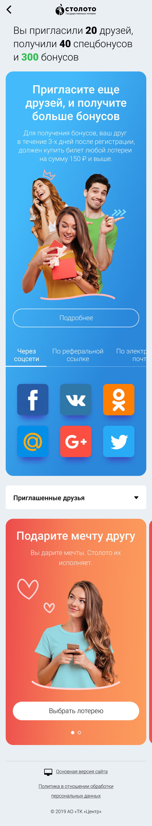 Stoloto Invite Friends bonus program interface
