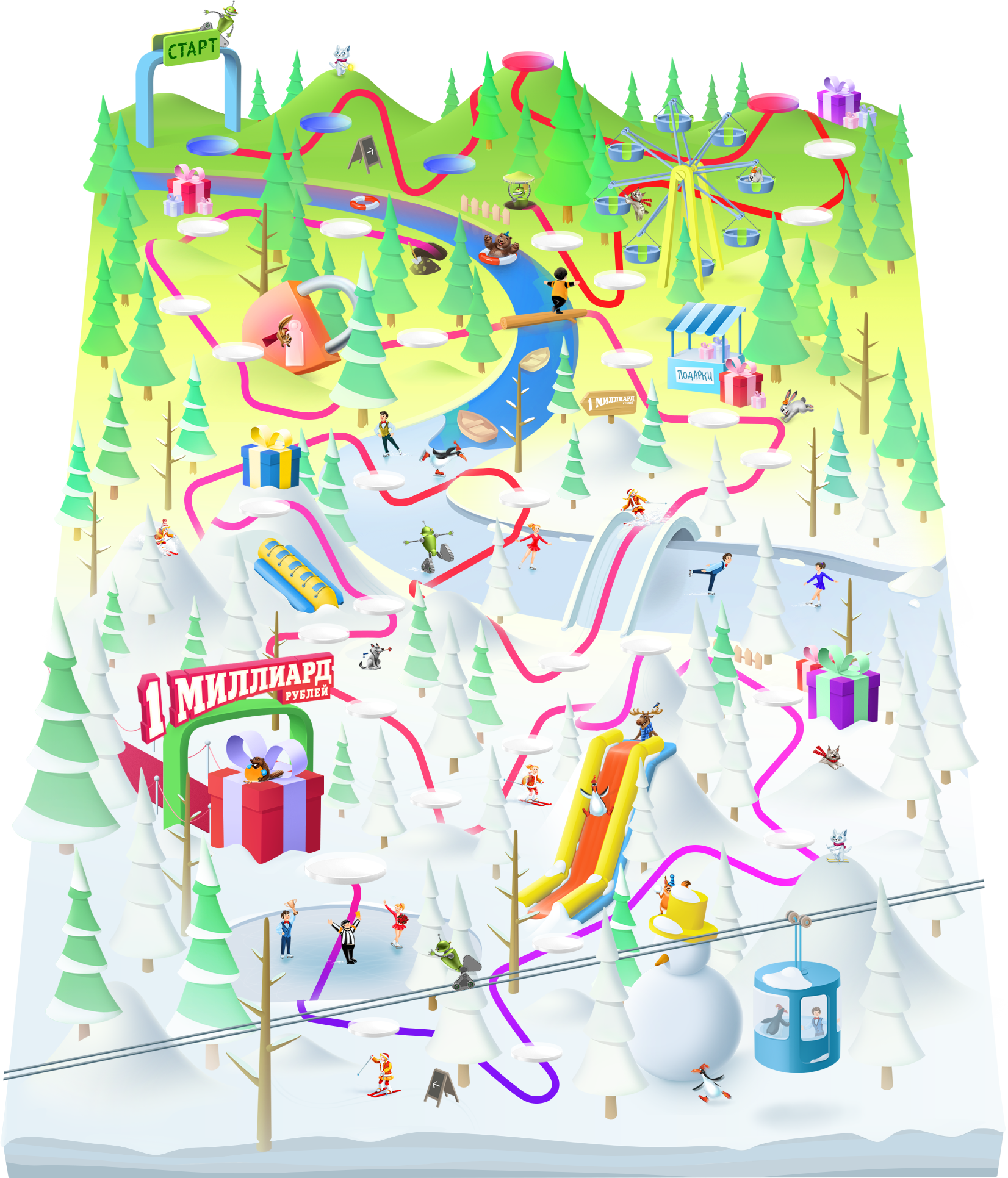 While waiting for the 1 billion ruble New Year prize draw, Stoloto players can try their luck by playing the holiday quest. Each purchased ticket for any of the holiday super draws will grant the player one move in the board game and a chance to win unique prizes. The website created at the studio displays the main playing field with familiar characters and contest rules.