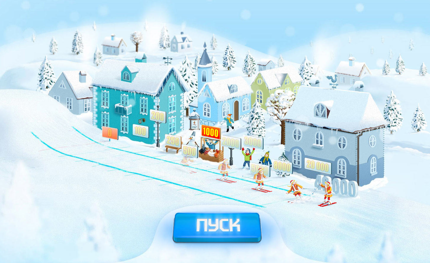 Website visitors who don’t want to wait until the next draw have a chance to play a lottery online. All they have to do is buy tickets, push the Start button and watch what happens next. The prizes are chosen randomly: the character ski jumps and lands by one of the signs with the prize amount.