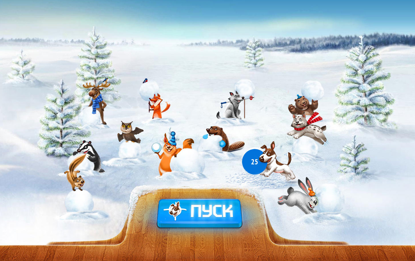The instant lottery is made to look like a snowball fight. Pushing the Start button, the player activates the random number selection mechanism. If lucky, it will result in hitting the animal holding the snowball with the prize.