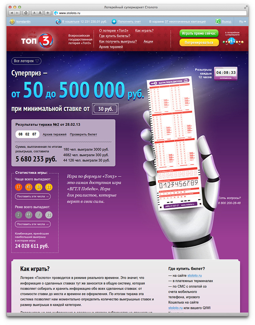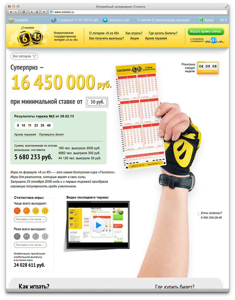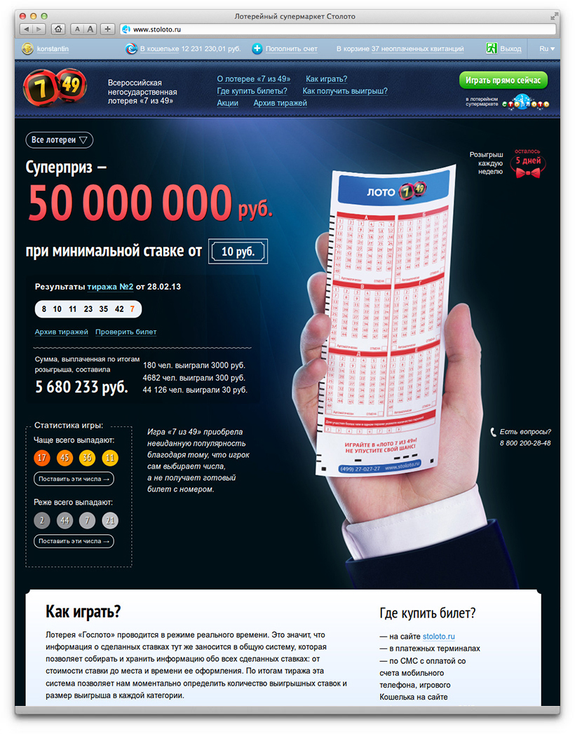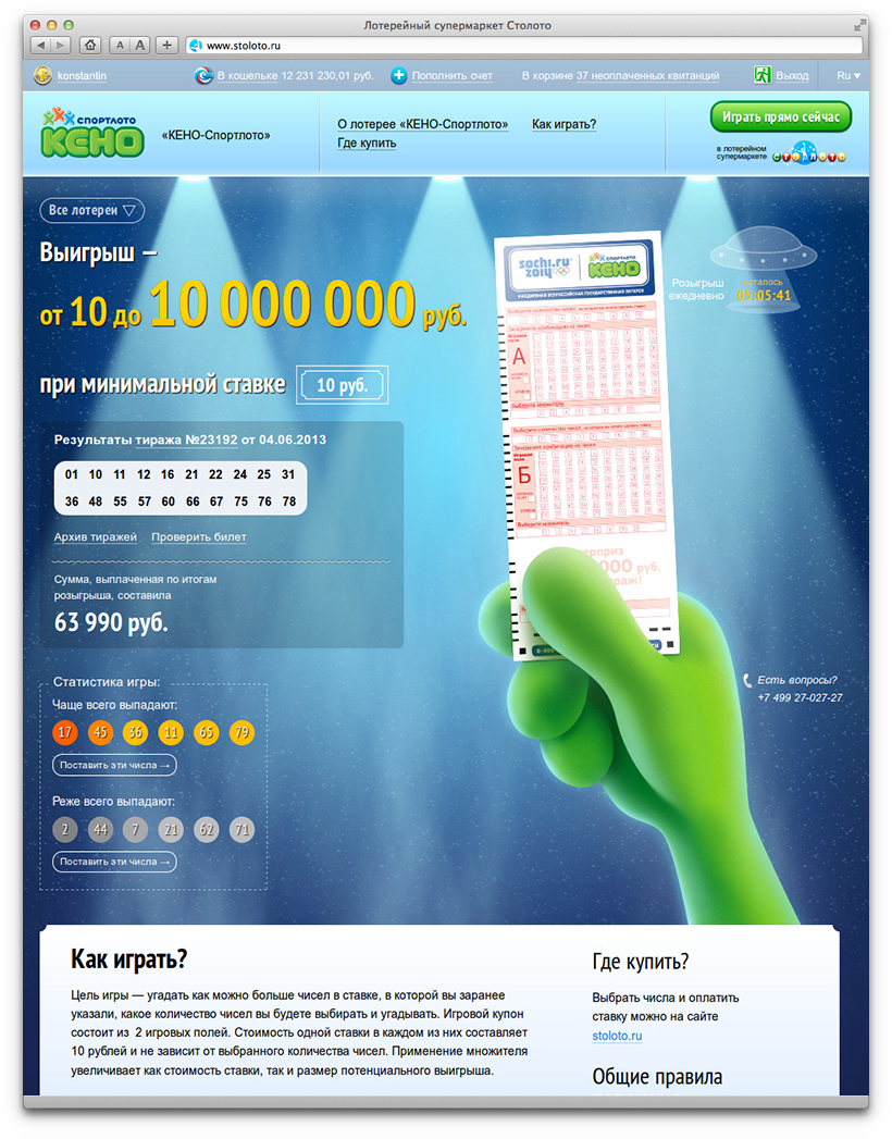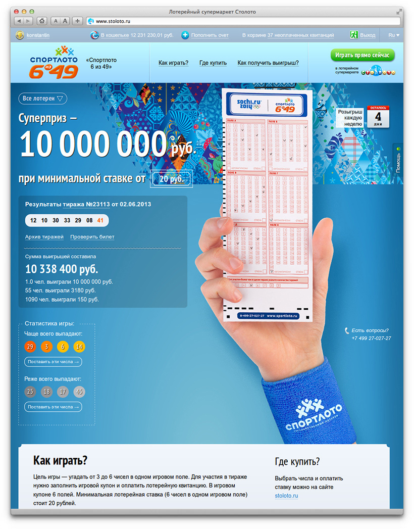 Promo websites tell about lottery rules, contain results of draws and guidelines for players, provide interesting statistics and can easily accommodate introduction of new lotteries. They share common principles of layout and design. Each page has three key elements: the background, the promo block and the hand holding a lottery ticket. Each lottery has a unique appearance.